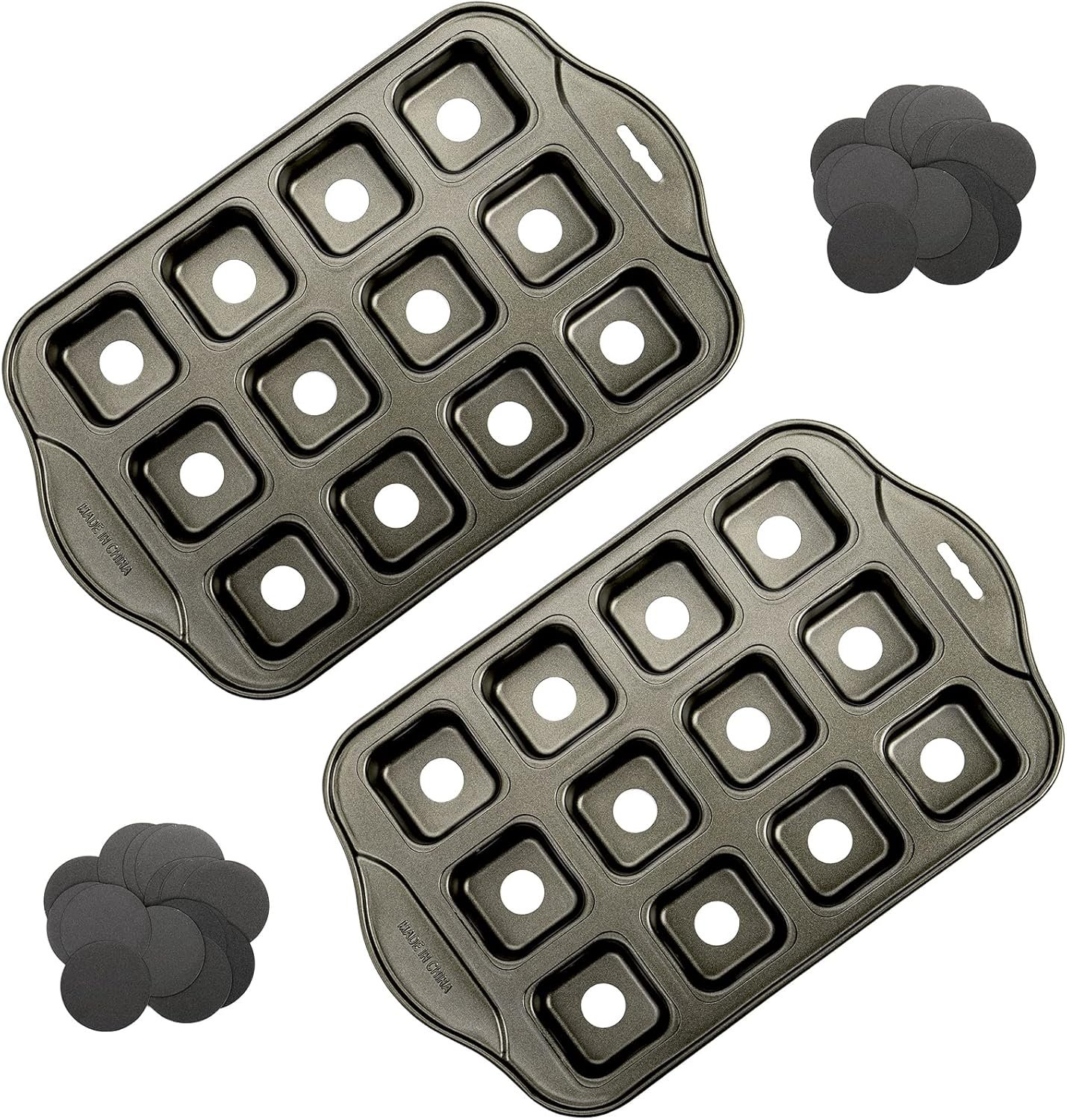 Value Pack Mini Sized Baking Pans: Package includes 2 non-stick baking pans with removable bottoms, each contains 12 square cavities. Unit Size: 13" x 8" x 1.25". Each capacity measures 2" x 2" x 1" deep.