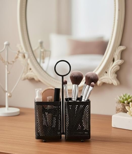 This is a versatile, compact organizer featuring a durable dual-compartment metal mesh design finished in classic black. It's engineered for multi-purpose use, serving perfectly as a stationery holder on a desk for pens and markers, a cutlery caddy in the kitchen for storing spoons and forks, or an elegant makeup brush holder on a vanity. The product includes a practical central ring handle for easy carrying and mobility, while the stable, compact base ensures it takes up minimal space on any surface. Its perforated mesh construction allows for excellent ventilation, keeping contents dry and organized.