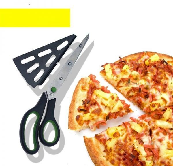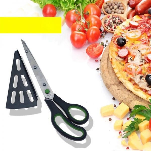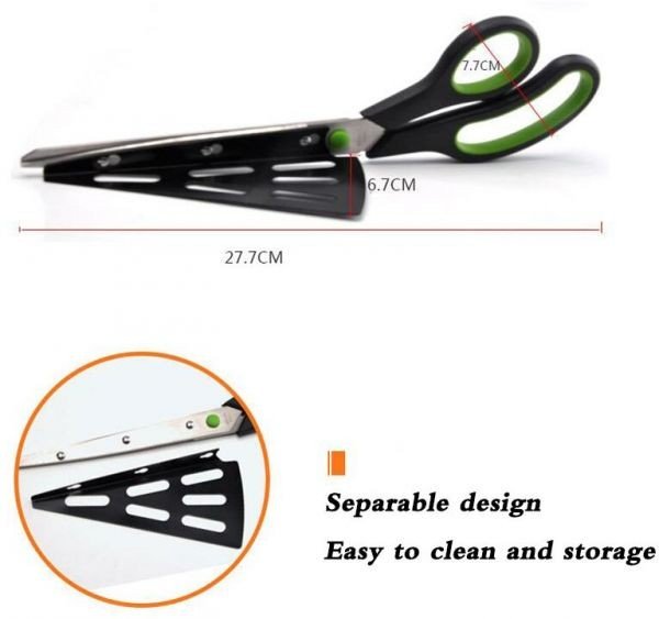 - Color: Green, Red. - Material: Stainless steel and PP. - Size: Approx. 27.5 * 7 * 1 cm / 10.8 * 2.8 * 0.4 inch (L*W*H). - High quality for durable and long-lasting use. - Lightweight for portable carry. - Stainless steel pie cutter lets you cut pie slices and serve them without damaging delicate pastry. - A removable spatula attached to the scissor means you can cut and serve pizza with ease!