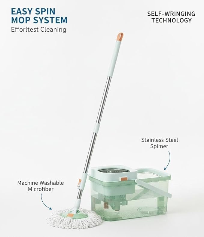 Upgrade your home cleaning routine with the Ultimate 360° Spin Mop System. This stylish and functional set is designed to take the labor out of floor mopping. The transparent bucket provides a modern aesthetic while letting you see your cleaning progress, and the industrial-grade stainless steel wringer allows you to control the moisture level of the mop with ease. Whether you are dealing with a quick spill or a deep weekly clean, the ultra-absorbent microfiber heads lift grime without scratching delicate surfaces. This all-in-one kit is lightweight, easy to carry, and built to last, making it an essential tool for every modern household.