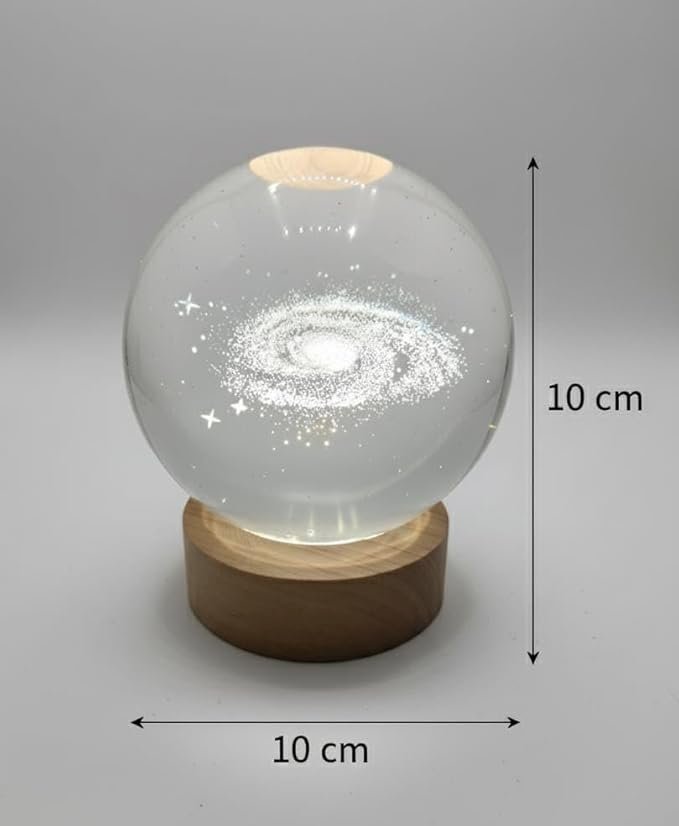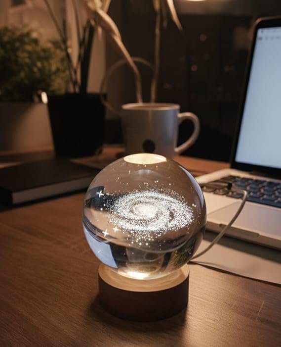 The Galactic Glow Crystal Sphere Lamp Bring the cosmos right to your desk with the Galactic Glow Crystal Sphere. This enchanting desk lamp features a highly detailed, laser-etched design of a spiral galaxy encased within a high-quality, clear crystal sphere. Resting on a simple, warm wooden LED base, it transforms any workspace into a serene, starry sanctuary. Perfect for late-night work sessions, as a soothing nightlight, or as a unique decorative piece, this lamp casts a gentle, comforting glow. It’s an ideal gift for astronomers, space lovers, students, or anyone who appreciates the calming beauty of the universe.