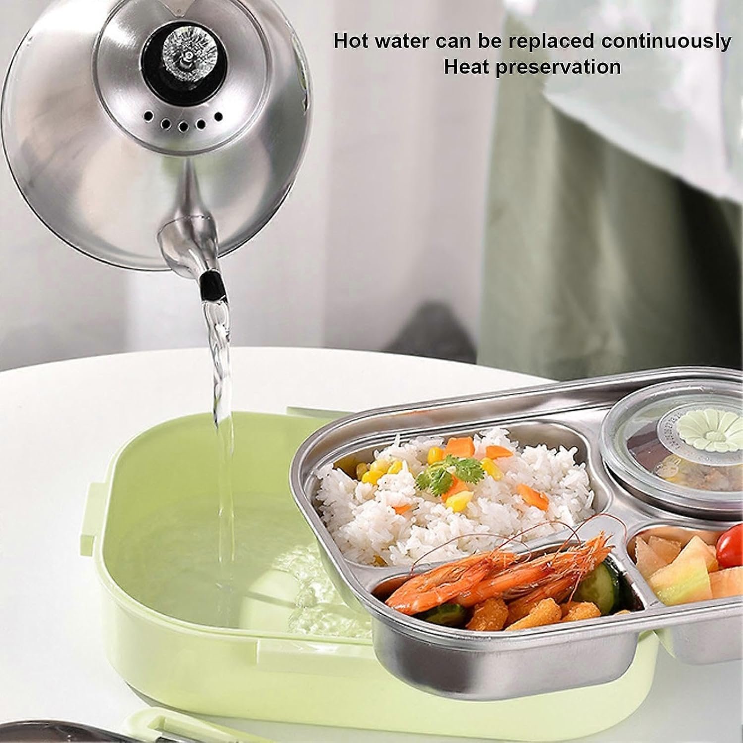 This stainless steel tray is detachable, because another useful feature of this lunch box is that you can pour some hot water to heat the food before eating. This will keep the original taste of the food.