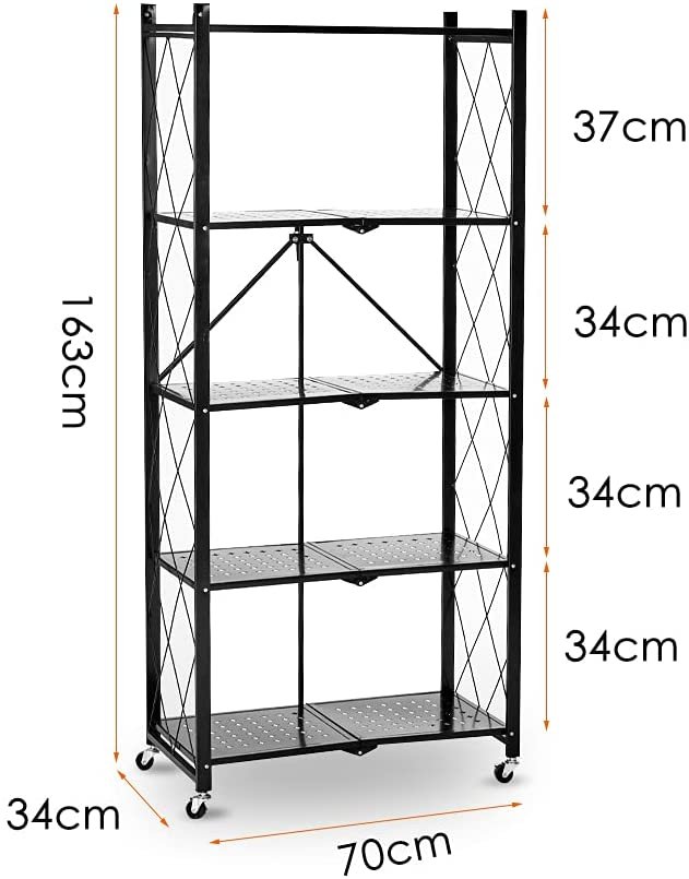 SPACE SAVING STORAGE RACK Foldable and 4 universal wheels Multipurpose Shelf Display Rack With size of 71cm L x 34cm W x 158cm H, and 4 Wheels Universal wheel would help you to make room to store large items. Bold and thick steel frame, 5-layer design, can place multiple equipment or goods. It can make the warehouse or room cleaner and more comfortable