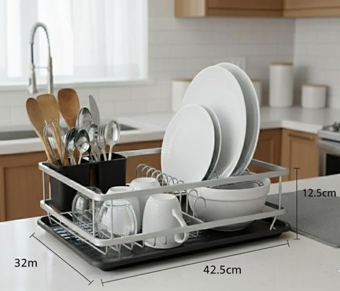 Black Dish Drainer Rack with Drip Tray - Come with a removable plastic drip tray for easy handling the excess water to keep the kitchen countertop dry and clean. Compact Size & Space Saving - Measures, the dish rack is great for most kitchen counters, solving your tableware storing and wet countertop problem. In addition, this draining board rack is washable and safe. Classify Storage - The sink drainer rack provides enough capacity to store various utensils, including dishes, plates, bowls and more. The removable utensil holder offers a extra space for your tableware. Durable & Rust-Resistant - Made of premium steel with high-temperature baking varnish, this drainer rack is rust resistant and durable to use. You don't need to worry about the counter mess at all. Super Easy Installation - Delivery with integrated rack design, tool-free assemble this kitchen drying rack. All parts, tools, and instructions needed are included. What's more, all parts can be quickly disassembled for cleaning.