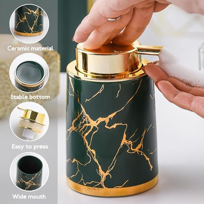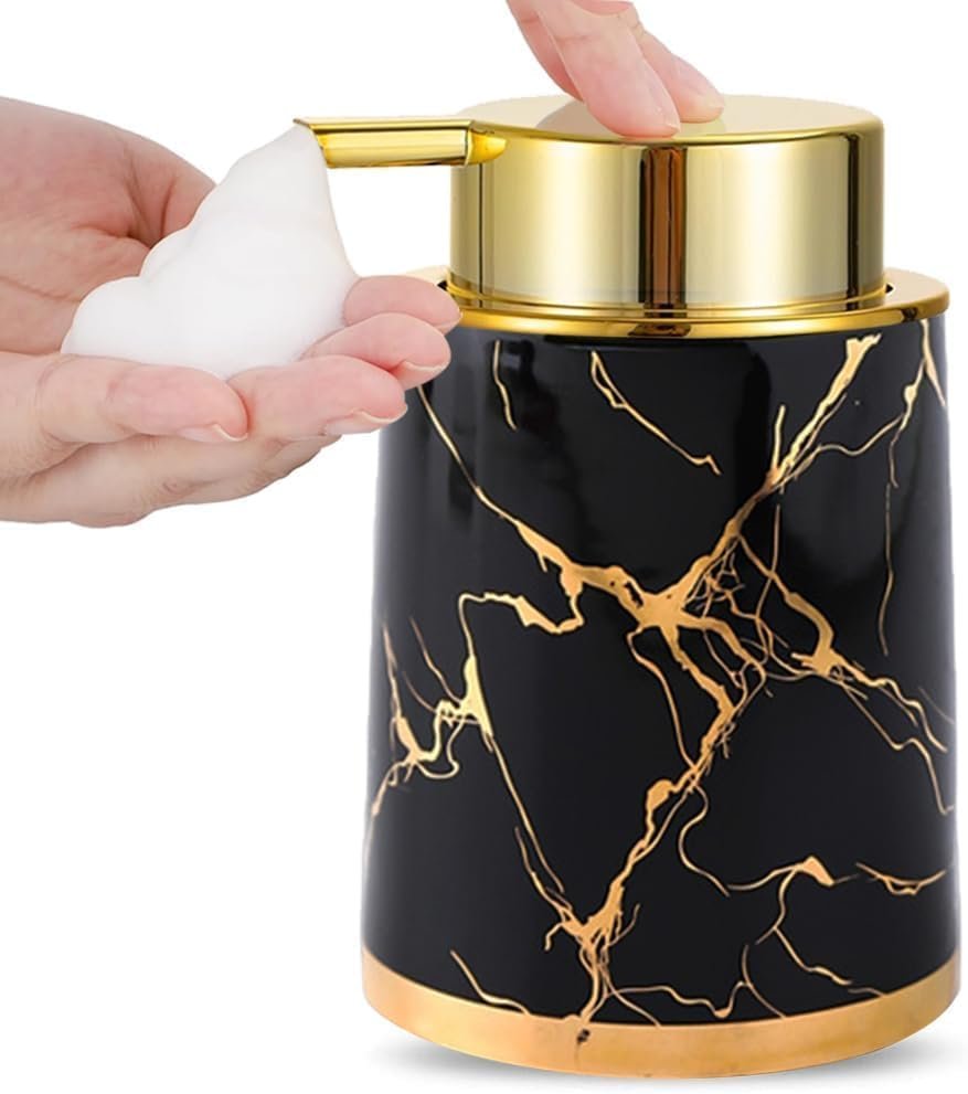 ✅Premium Ceramic Foaming Soap Dispenser: Made of high-quality ceramic, stylish foaming soap dispenser is durable and sturdy. The appearance is designed with unique marble pattern with the matte gold foaming pump, it can perfectly decorate your bathroom. Not only it is a high-quality foam soap dispenser, but also a very surprising bathroom decor. ✅Foam Soap Dispenser Pump: The lotion soap dispenser uses a large area press foaming pump made of premium plastic, which can produce rich foam, and the nozzle down is not easy to leave excess soap. Or use 6-7 times more water diluted liquid to act as a filler. Please clean the pump head regularly to avoid clogging of the pump. After removing the pump head, it can be used as a toothbrush holder or makeup brush storage.