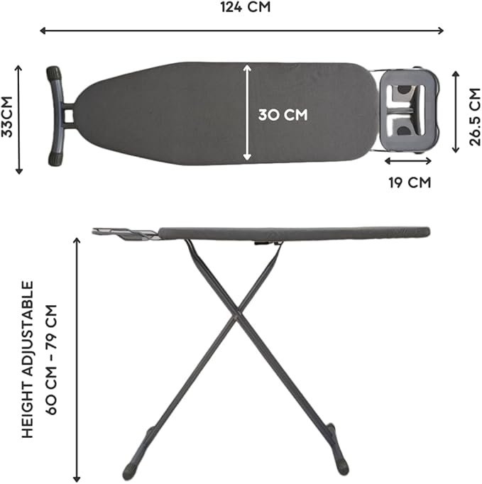 The Perfect Ironing Board for a Practical Lifestyle and Limited Spaces! Are you looking for an efficient solution for your ironing needs without taking up too much space? This foldable ironing board is the perfect choice. It is designed to combine durability with easy storage, featuring a sleek grey frame and a high-quality padded cover. It can be set up in seconds, and when you're done, it folds completely to lean against a wall or fit neatly in a closet effortlessly.