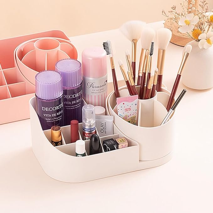 This storage box can not only be placed on the dresser but also can be used as a desktop storage. It is versatile and can be placed in the office. The rotatable part on the left is for your writing pen, so you can view and get items from all directions. The part on the right can be used for notes, staplers, etc., making your desktop look clean and tidy .