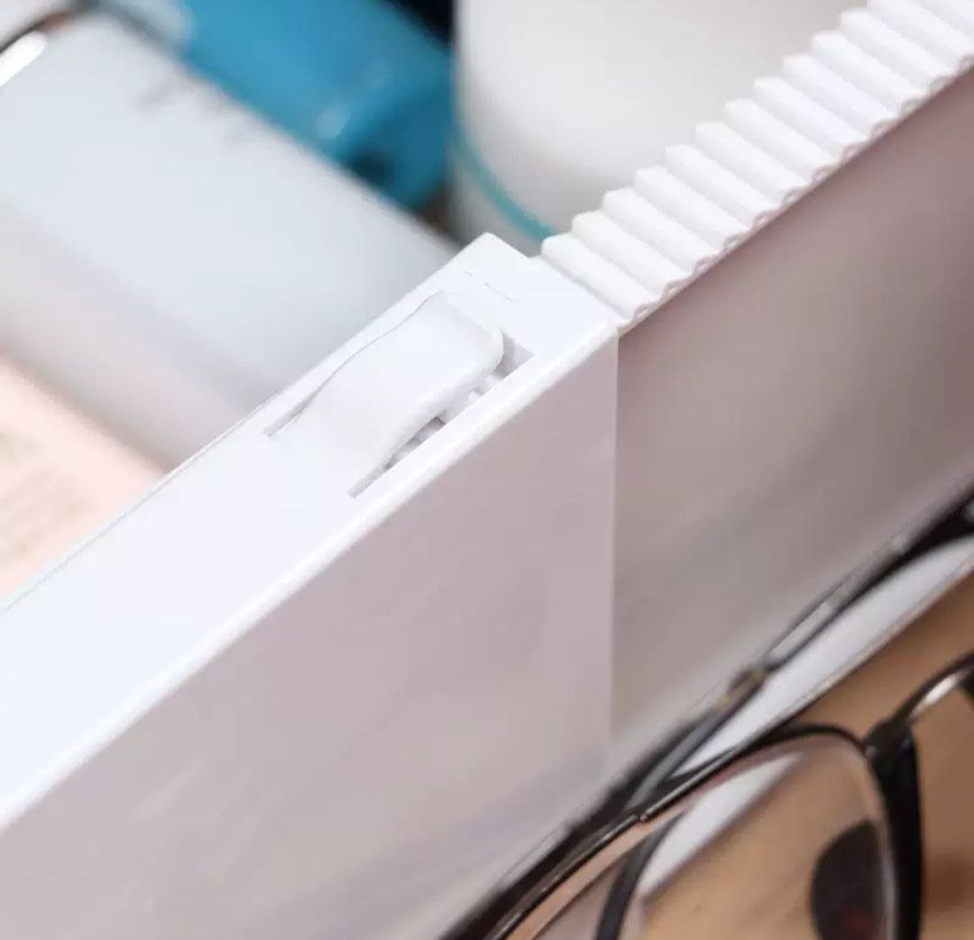 【Easy Installation & Removal】 Press the top button to adjust the length before placing, and stretch it out again to secure it tightly before locking it. The drawer dividers can be installed easily and quickly without any tools or glue. To retract, lift up the top button and push the stretched side.