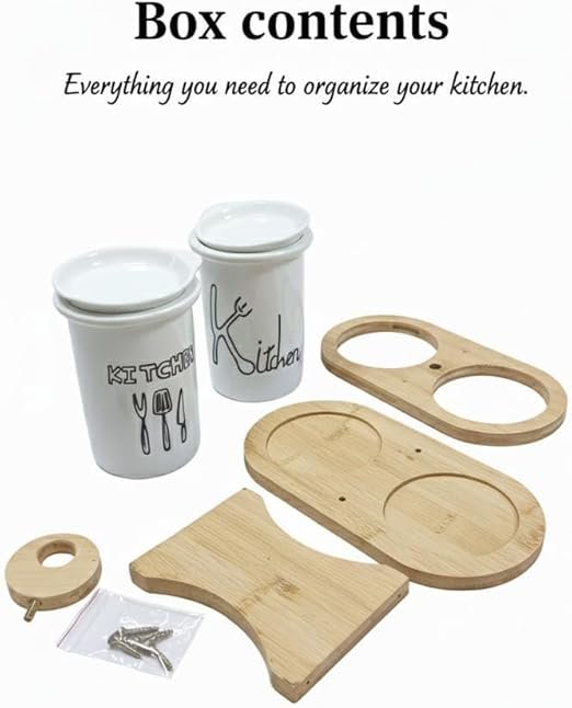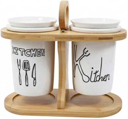 Two-Tier Kitchen Cutlery and Utensil organizer that blends organic textures with clean ceramic aesthetics. It features two white cylindrical ceramic jars, each adorned with charming hand-drawn style "Kitchen" typography and utensil illustrations, providing a playful yet sophisticated look. These jars are suspended within a sturdy, natural bamboo frame that includes a solid base with recessed grooves to catch drips and a top support ring to keep the canisters secure. The design is completed with a central bamboo handle for easy portability and two matching ceramic lids to keep contents clean. Its compact, vertical footprint makes it an ideal space-saving solution for countertops or dining tables, doubling as both a functional storage piece and a decorative farmhouse-style accent.