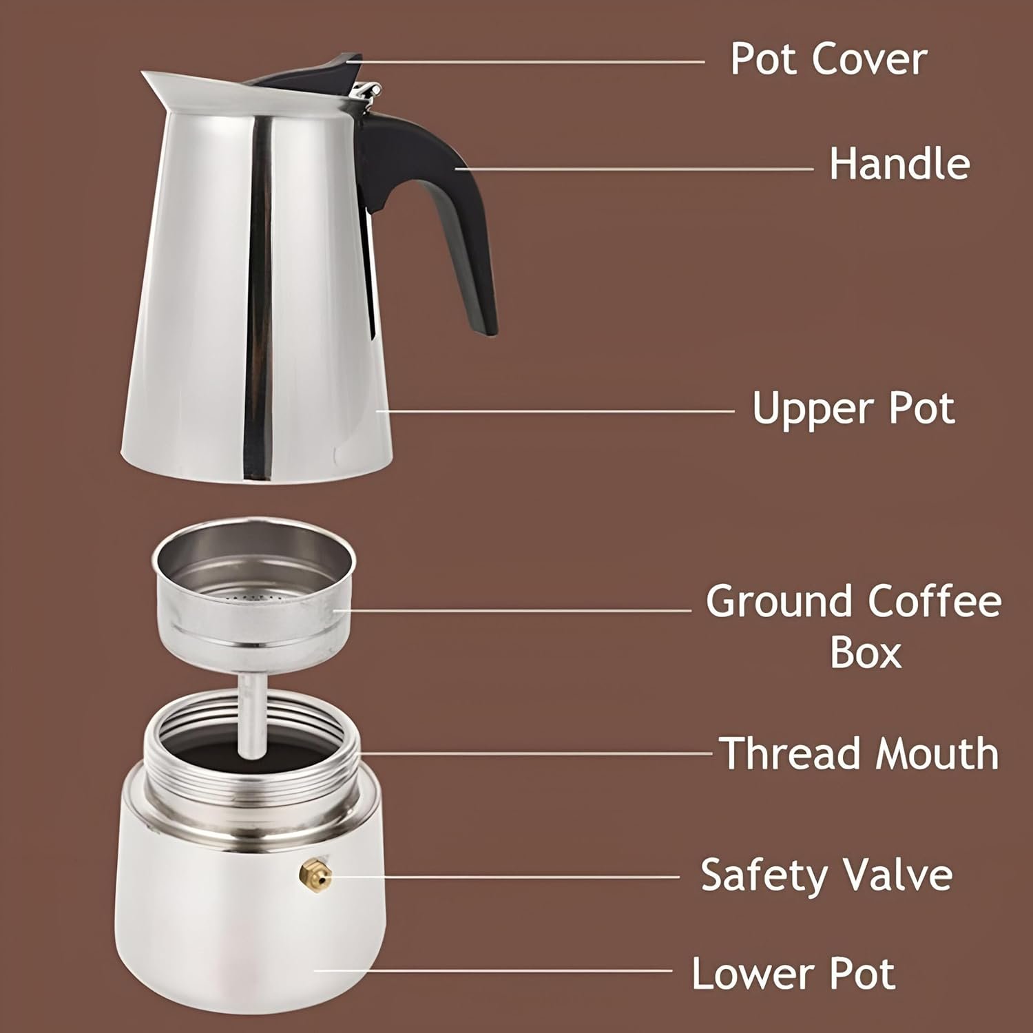 The espresso coffee maker is made of high quality food grade stainless steel, sturdy and durable. Different from cheap materials, this material can make the coffee softer and bring you the pleasure of high-quality coffee. Ergonomic Handle --- Ergonomic heat insulated handle and easy pour spout, as well as good sealing, make your life high quality. Ergonomic handle for finger grip and easy to use. ELEGANT DESIGN --- A masterpiece of timeless design, this espresso coffee maker is a must have for every kitchen. Polished mirror surface makes it look elegant and exquisite. Safety Valve