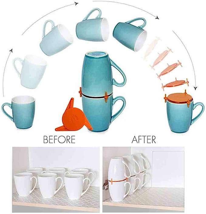 Very easy to use, just place one Stacker on top of a coffee cup, then set another one upside-down, right on top. Give the Stacker a gentle squeeze to adjust to the size, and your coffee cups are safe and sound, in just the right amount of space. Very practical kitchen organization and storage gadget.