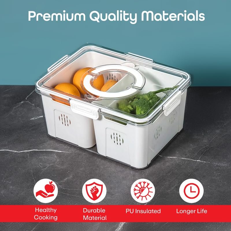 Versatile Storage: This container is designed to keep fruits and vegetables fresh and organized in your kitchen or pantry. Durable Construction: Made from high-quality, food-safe materials, ensuring long-lasting use and easy cleaning. Ample Capacity: Spacious interior accommodates a variety of produce items for convenient storage. Ventilation System: dozens of drainage holes promote air circulation, helping to maintain freshness and prevent spoilage. Space-Saving Design: Compact and stackable, allowing for efficient use of available storage space.