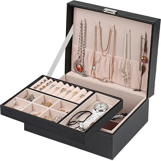 2 layers type of jewelry, making your jewelry collection more organized, L*W*H:23x17x9cm/ 9x6.7x3.5inche; Delicate lock and synthetic leather result in a harmoniousunity, making the jewellery box an eye-pleasing catch, adds a sense of tenderness and elegance to your dressing table; The exterior is made of high quality PU leather, durable, waterproof and moisture proof. The interior is made of beaded flannel, it can protect well your jewelry from scratches; Small jewellery organiser box for rings, necklaces, earrings, ear studs, cufflinks and other little jewellery. It would protect your jewellery inside against fingerprints, scratches, damages and theft