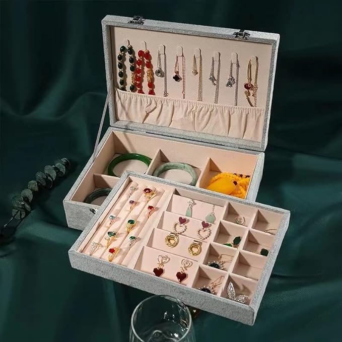 The large jewelry storage container is made of advanced ice velvet light grey color environmental friendly and anti-abrasive Soft bead suede lining interior will take care of your expensive and beautiful jewelry