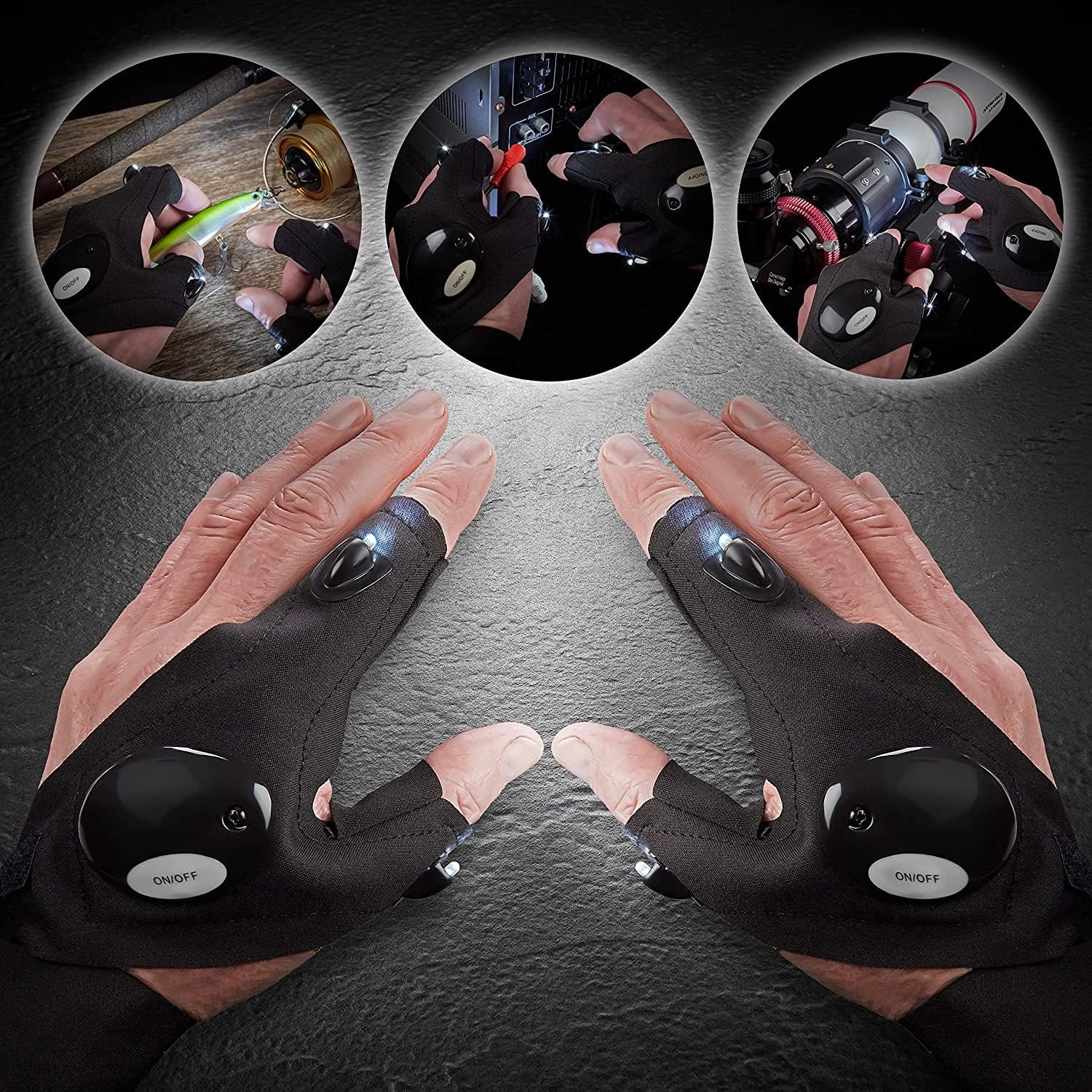 Bringing light to your fingertips, a flash torch never drops making you hands-free when repairing, and fishing. Comfortable stretched neoprene material, with position adjustable magic strap Cool gloves make you a spy at night. Easy turn on and off.SPECIFICATIONS Material: cotton; silicone; PP Size: 5.3*14.2 inches