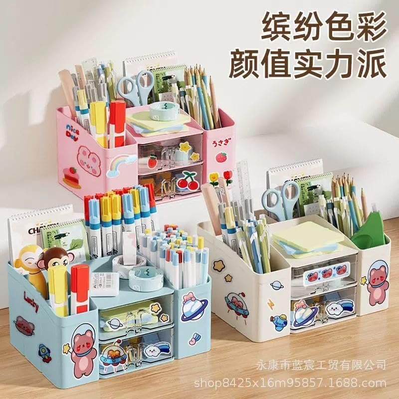 Pen holder desk: with the desk organiser, you can make everything clear at a glance, say goodbye to messy desks, the best choice for home offices, ensure a tidy environment and save space. Organiser desk: the children's pen organiser comes with 5 compartments and 2 transparent drawers, you can organise and store your daily things. Such as pens, scissors, sticky notes, etc. The pen holder desk is the best choice to keep your desk clean and tidy. Desk accessories: desk organiser is made of high-quality plastic, with smooth, burr-free edges, transparent drawers, easy access to items and reusable. Desk organiser drawers: the size is 19.5 x 14 x 10 cm. It is the perfect size for your desk, maximizes your vertical space and helps you save space. Also the best gift for your students and friends. Multifunctional pen organiser: this multifunctional desk organiser for children can not only be used to store various office supplies on the desk surface, but can also be used as a cosmetic organiser. You can put lipstick, combs and other daily necessities in it.