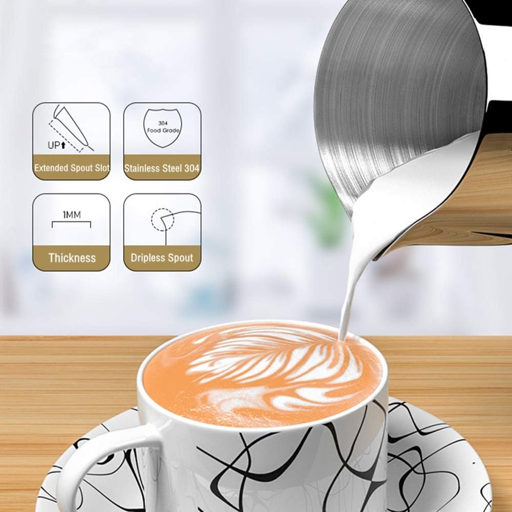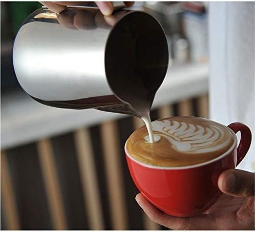 SUITABLE CAPACITY: Total Capacity of 550ml / 20fl.oz milk frothing pitcher, for cappuccino you can prepare 2 cup or 3 small cups of cappuccino latte macchiato coffee, and the little spout allows you to play at doing "latte art". Be sure not to fill the milk up higher then the pour indentation begins. Since it is a 20oz it tends to fill up quickly when steaming.