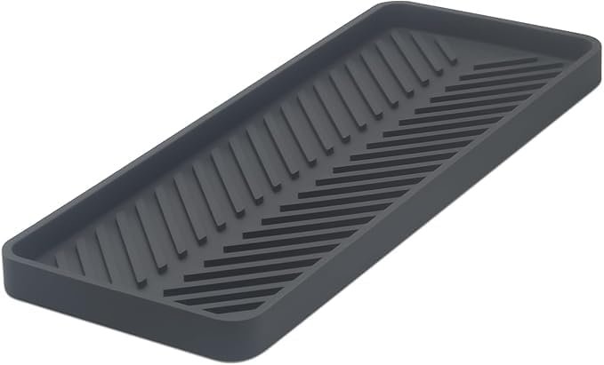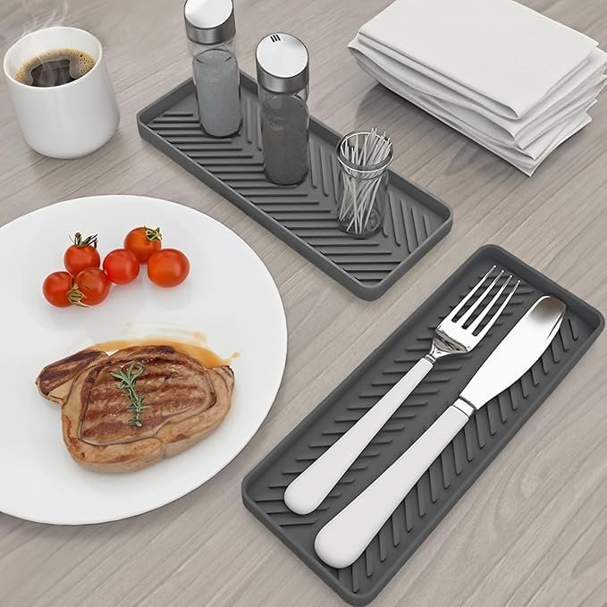 【Unique Design】Featuring 45-degree double rows of raised ridges and raised edges, the design is unique and makes your home decoration look perfect. It prevents water from spilling and helps dry wet items better. The non-slip bottom keeps the silicone organizer tray stable on your sink or countertop.