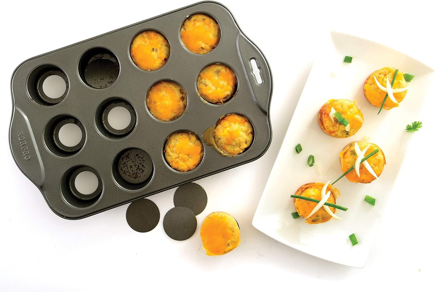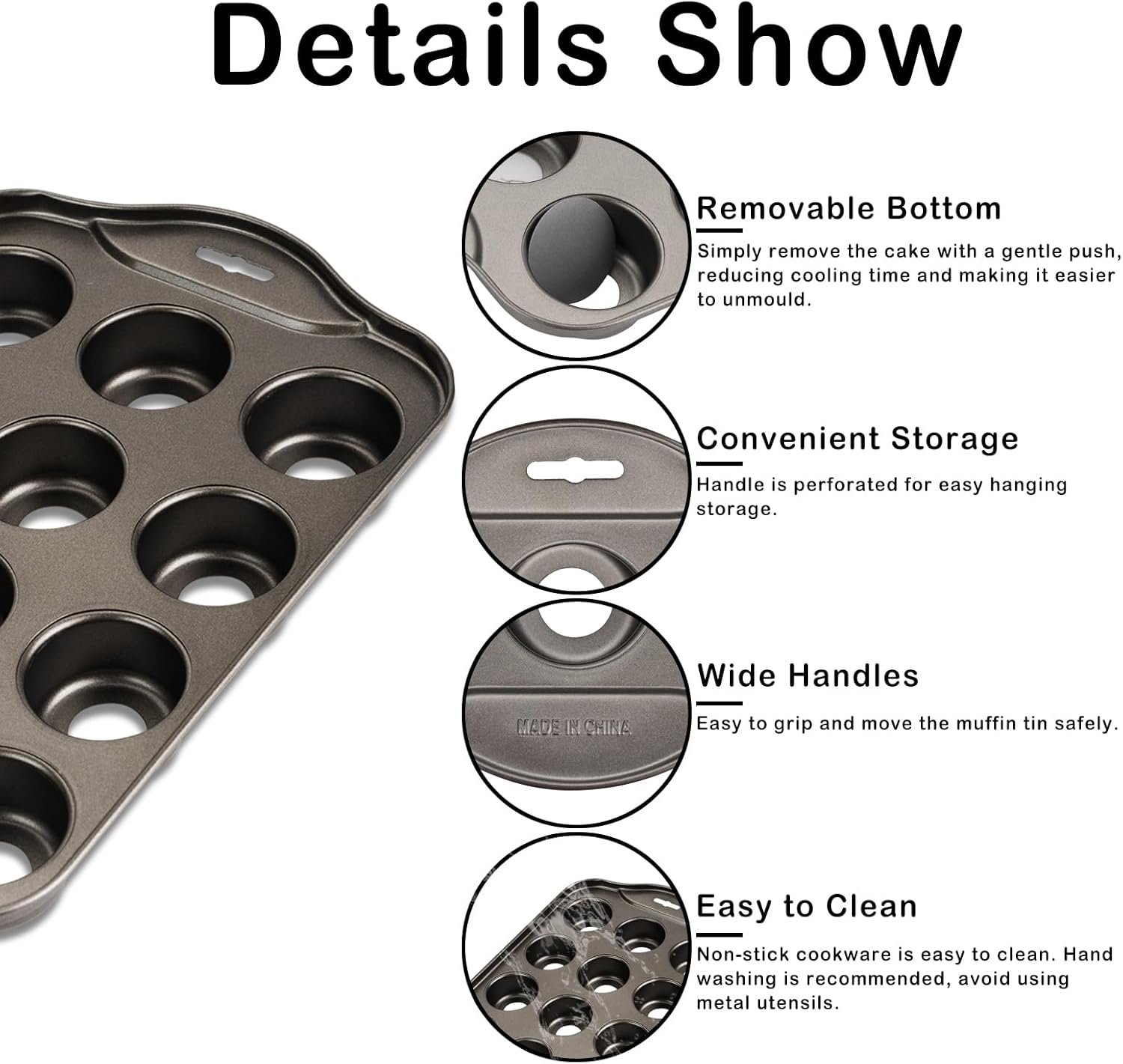 ?【Removable Bottom】The bottom of the mini muffin tray is removable for easy removal and decorating of food. Shorten the cooling time of the cupcakes, speed up the release and cleaning, improve the working efficiency.