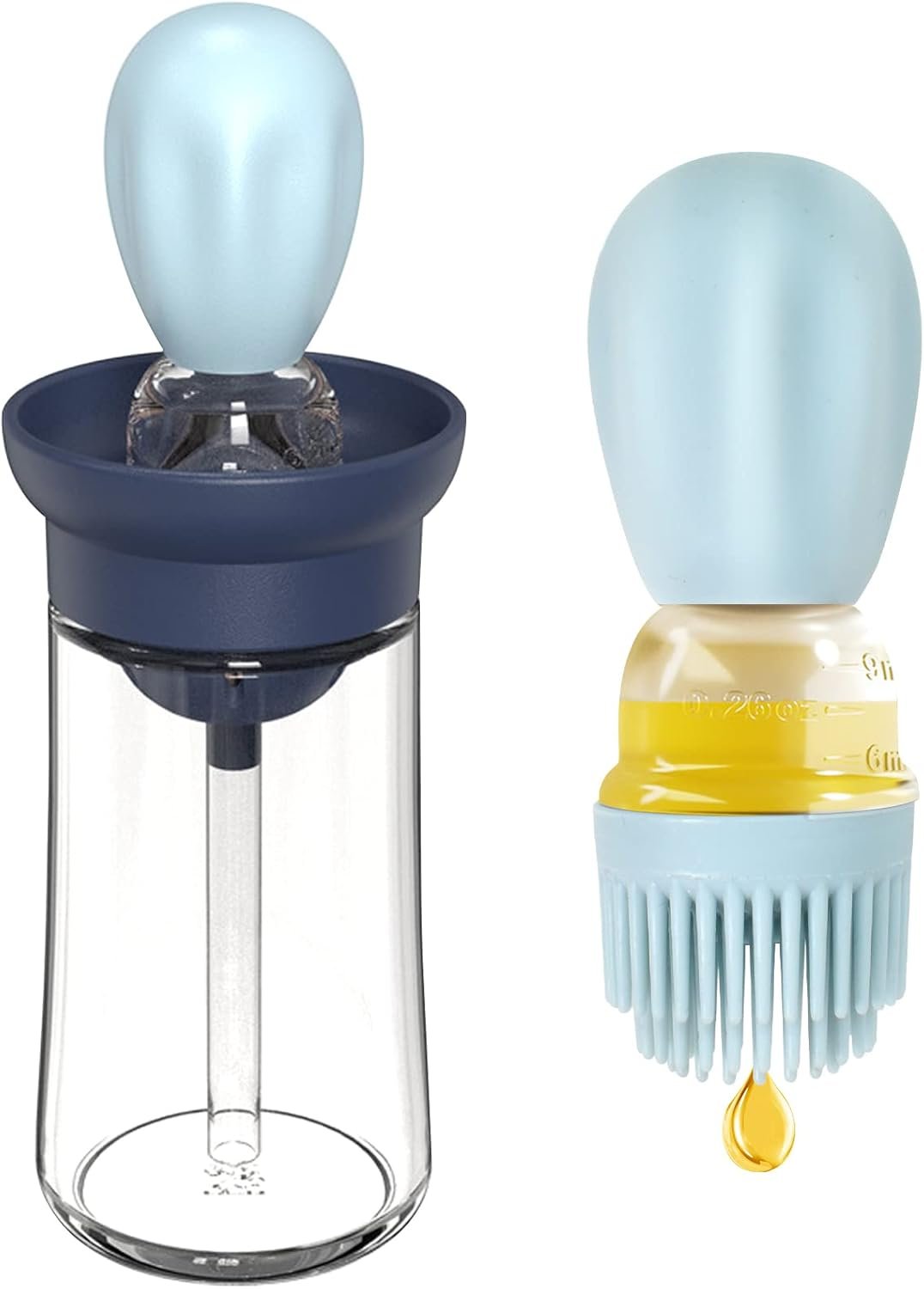 Special Unique Design - All-New 2-in-1 silicone oil basting brush with oil dispenser makes spray oil easy and quantitative. The oil brush spot is composed of silicone pipet head, AS transparent oil storage space with measurement scales, T shape silicone brush, PP filter funnel, PE straw and glass bottle. Just squeeze the silicone pipet head you can basting oil easily