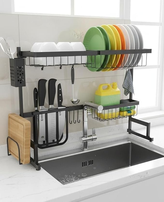 Materia - Made of quality advanced 304 stainless steel with baking finish surface, easy to clean and rust free. Baking finish surface keeps the dish rack scratch resistance and lasting for a long time. High capacity:The drying rack can could hold bowls, plates, vegetables, fruits, knives, forks, spoons, pans, detergent. Save space:The versatile dish is perfect to utilize the empty space above sinks. The water drips directly into the sink will not wet the countertop, keeping your kitchen clean and fresh. Multi Purpose Kitchen - the sink dish drainer can not only air-dry washed bowls, pot, fry pans, tableware, cookware, etc., but also be used as a colander for . Card-position design: better draining effect. A certain gap between the dish and the dish can achieve quick draining and less likely to breed bacteria.