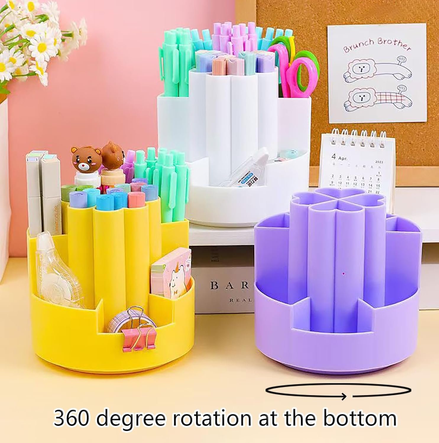 360° Rotating Pen Holder for Desk Organizer: The rotating pen holder is equipped with a base that can rotate 360 degrees and it rotates smoothly without getting stuck. The rotary desk organizer design allows you to easily access your pens, pencils and other supplies from any angle. Cute & Compact Design: 5.1 inches in diameter, the highest slot can put tall brushes, pencils, pens, rulers, pencil knives. The medium slot can put short brushes, concealer pen, mascara, scissors. The lowest slot can put lipsticks, nail polish, beauty blender, erasers, tapes, etc. Superior Material: Crafted from durable ABS plastic, desk supplies is designed for long-term use, providing exceptional strength and solidity. Rotating pen holder for desk ensures that pencil organizer maintains office supplies for desk pristine appearance over time, even with regular use. Versatile Organizers: Pen holders versatile design makes pencil cups for desk suitable for use in various rooms, such as craft rooms, playrooms, laundry rooms and even bathroom cabinets. Additionally, pen holder for desk aesthetic helps in keeping office supplies for women, remote controls, headphones, chargers and more, well-organized and within reach. Multi-Functional Use: In addition to the office, this rotating cup can also be used to organize craft supplies, makeup, sewing kits, or anything that needs compact storage on your desk or table.