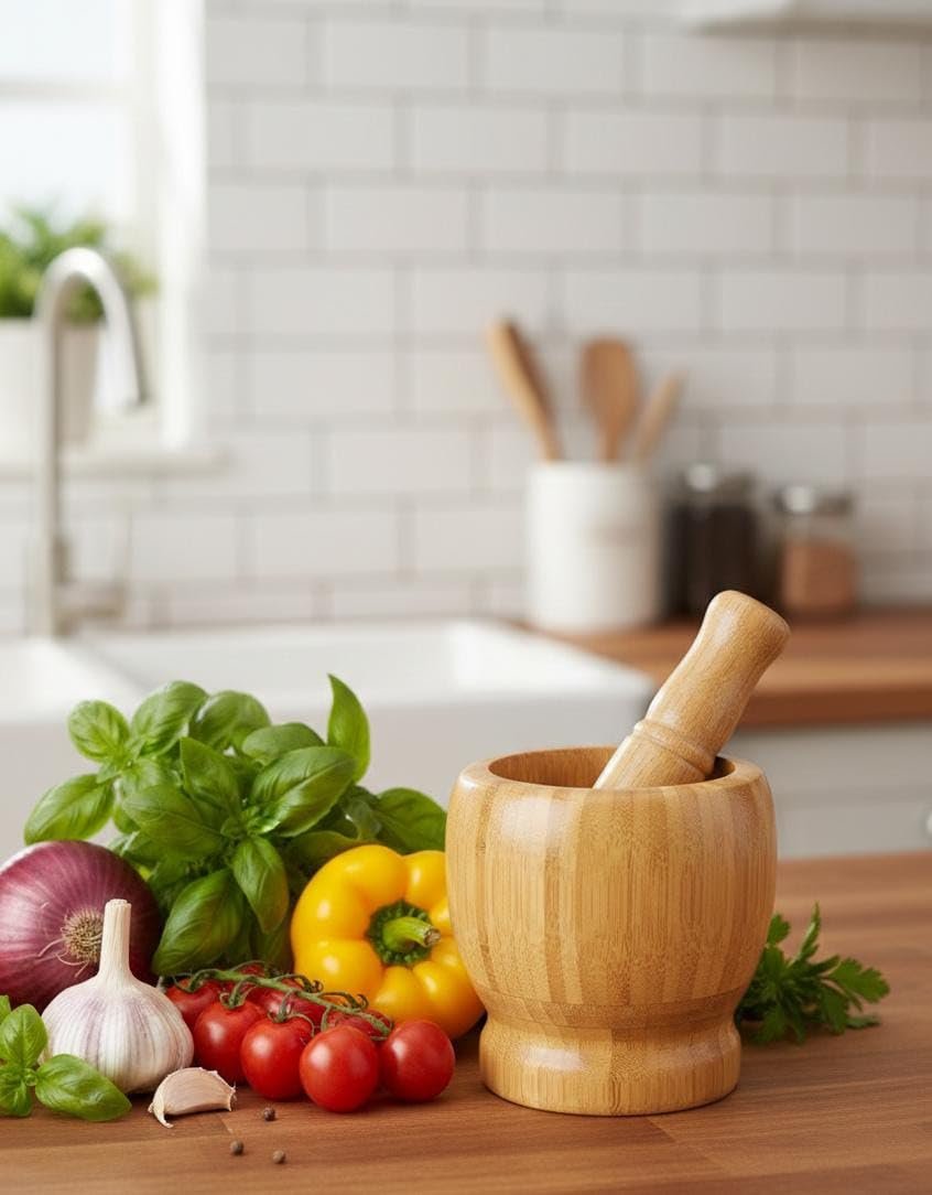 Experience the essence of fresh cooking with this handcrafted Bamboo Mortar and Pestle Set Designed to be a durable and lightweight alternative to heavy stone grinders this set allows you to manually crush and grind ingredients to unlock their full aromatic potential Its natural bamboo construction is not only sustainable but also provides a warm rustic aesthetic that complements any kitchen decor Whether you are preparing a traditional pesto crushing fresh garlic or grinding whole spices this set ensures a smooth and efficient process every time