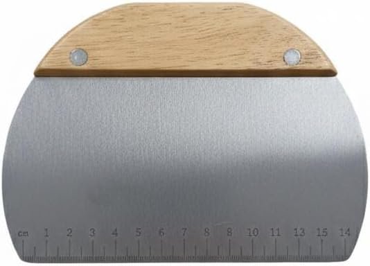 This professional-grade bench scraper is an essential tool for any baker or home cook, designed to bring precision and efficiency to your kitchen. Featuring a durable stainless steel blade with a wide, curved edge, it excels at portioning dough, scraping surfaces clean, and chopping vegetables into uniform pieces. The top of the blade is securely fastened to a smooth, ergonomic wooden handle with reinforced rivets, providing a comfortable and controlled grip during heavy use. To ensure perfect results every time, the blade face includes laser-etched measurement markings along the edge and a convenient quick-conversion chart for kitchen math at a glance.