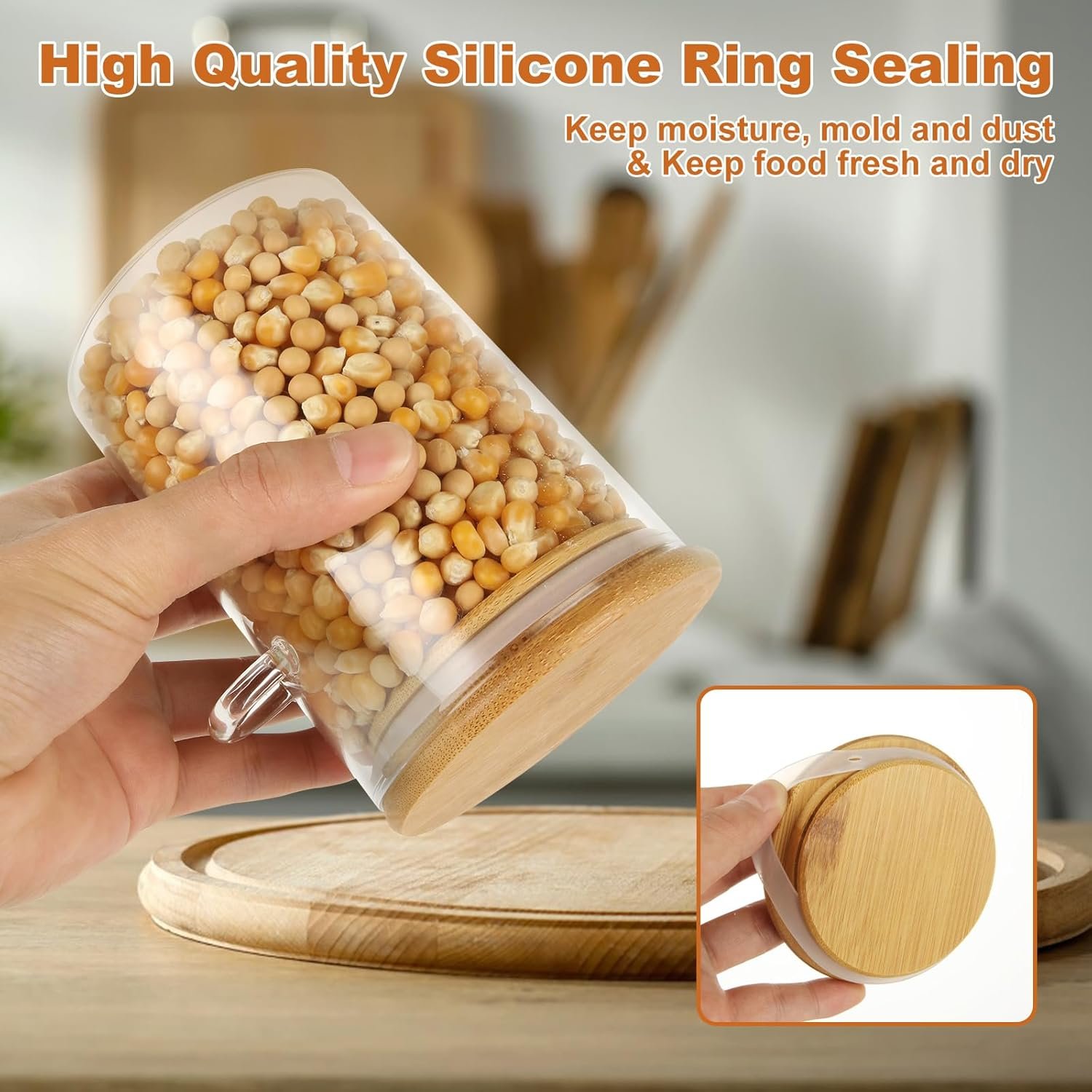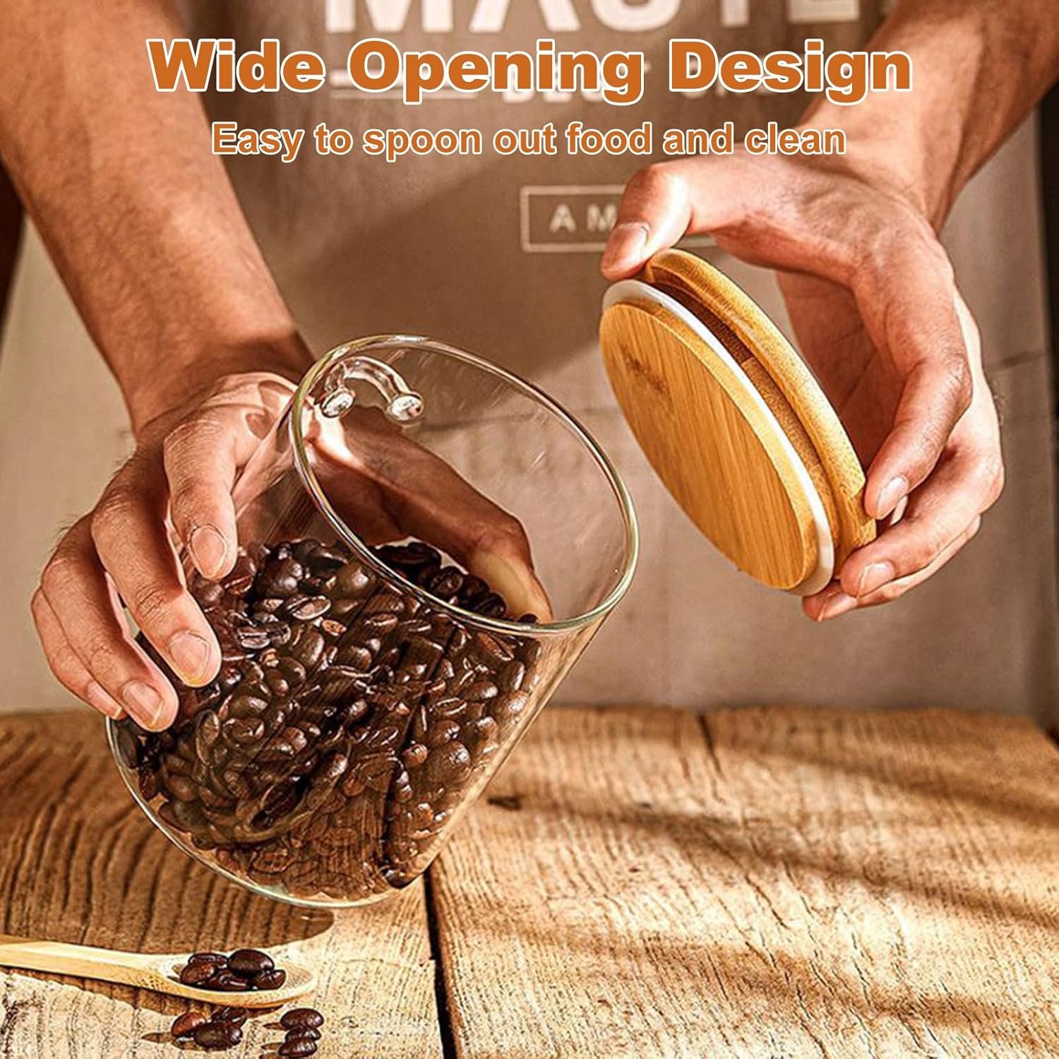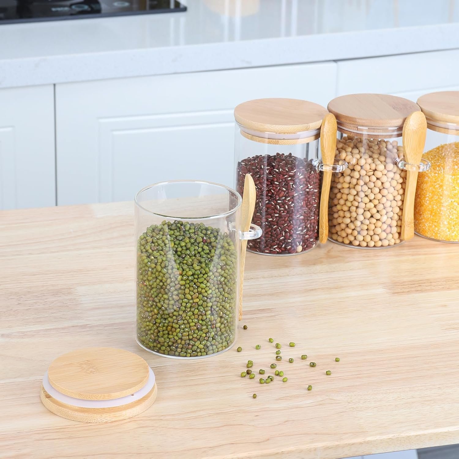 【Convenient Storage】Glass jars with bamboo lids and spoon make your life easier and your home decor more beautiful. These glass containers contain bamboo lids and spoons inside; They are sealed with silicone seals, which can safely store various dry goods; Make your kitchen neat and stylish, with a minimalist style that better matches home decor. 【Easy to use】 Each glass jar with an airtight lid has its own bamboo spoon in front of it; When you need to retrieve something from a glass jar, using it will be more convenient and efficient. 【Durable】Ordinary glass is easily cracked and broken; These glass jars are made of high-end borosilicate glass; In addition, we use high-quality bamboo to make lids and spoons, which are more sturdy than most wood, metal, or plastic