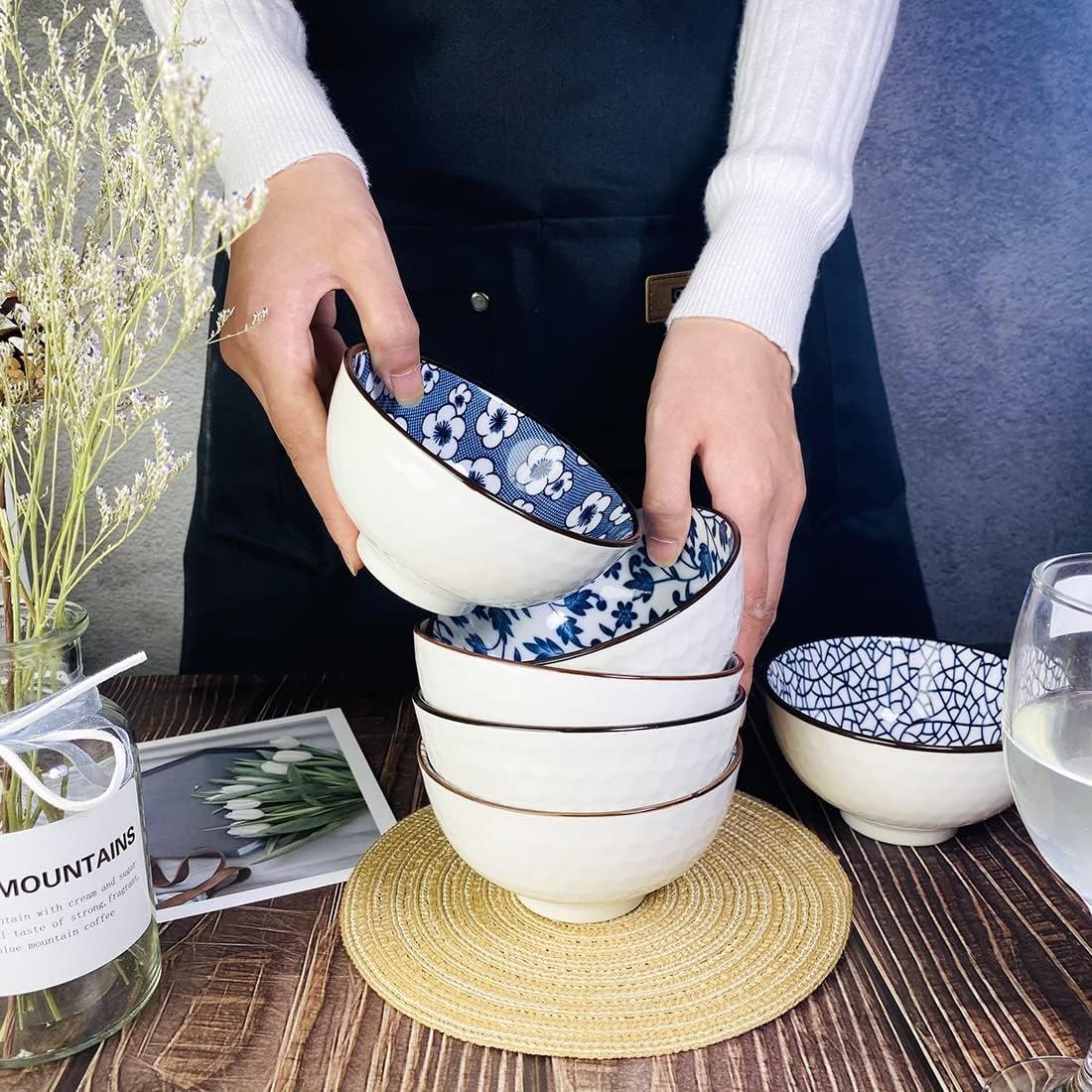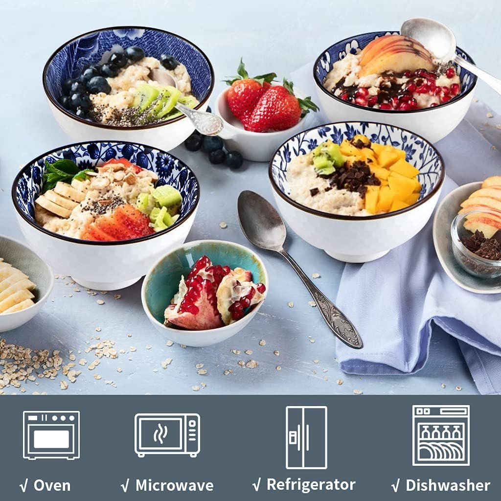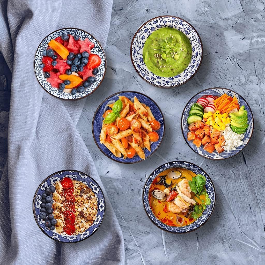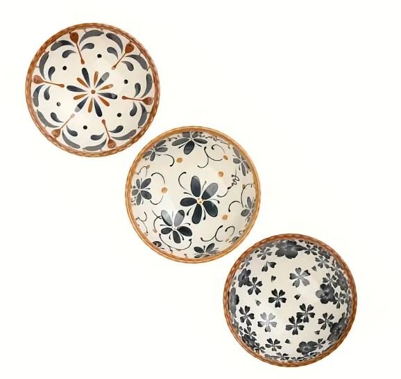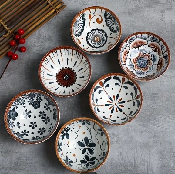 Each bowl features distinct patterns - from delicate floral motifs to striking geometric designs - making every piece a unique work of art. The set includes two bowls adorned with charming flower patterns, one with an elegant sunburst design, and another with a sophisticated chrysanthemum illustration.