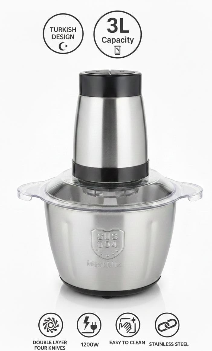 Upgrade your kitchen experience with the Meat Mix Pro Chopper. Whether you are prepping meat for burgers or finely dicing vegetables for salads, this 1200W powerhouse delivers professional results every time. Its elegant Turkish design and large 3-liter bowl make it a must-have tool for every home chef. Durable, powerful, and easy to use.