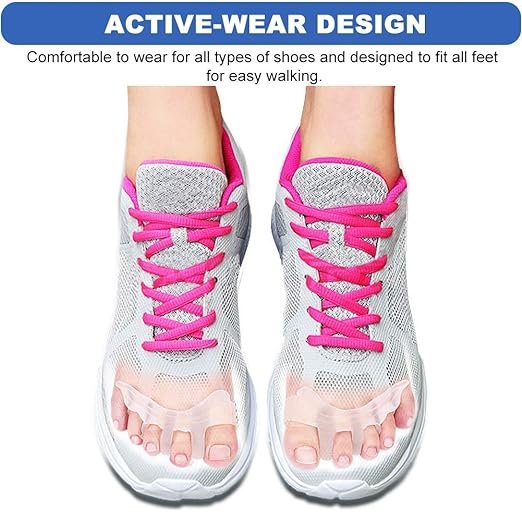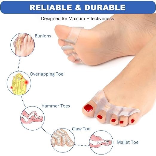 TOE SEPARATORS FOR PAIN RELIEF: Entire toe separator to relieve your foot pain, exercise your toes to treat and prevent various foot problems, such as bunions, plantar fasciitis, hallux valgus, and hammer toe, and separator must fit close to the webbing of feet. ONE SIZE FITS SPREADER: This gel toe separation is easy to slip on your toes and gently separate toes and stretches plantar fascia, one size can fit most medium and large feet. This toe spreader silicone is comfortable to wear for all types of shoes and designed to fit all feet for easy walking. MEDICAL GRADE GEL: Toe posture corrector designed with latex free and stretchable medical grade gel, gives a massage to your feet, good for foot alignment, and there is no need to worry about irritations and allergies. Easy to wash with water and soap. HOW TO USE: This toe spacer correct toe is perfect for people having foot problems, yogis, athletes and ballet dancers. It can be uncomfortable at an initial level, but you can start wearing toe straighteners for almost 10 – 15 minutes and increase the time to one hour for good results. It is good to paint your toenails and pedicure. HUMAN ENGINEERING DESIGN: The curved design conforms to the physiological structure of the foot. According to the growth curve of the body's feet to build a reasonable to carry out the sub toe to prevent overlap, and then the orderly arrangement of correction. Avoid extrusion, promote blood circulation