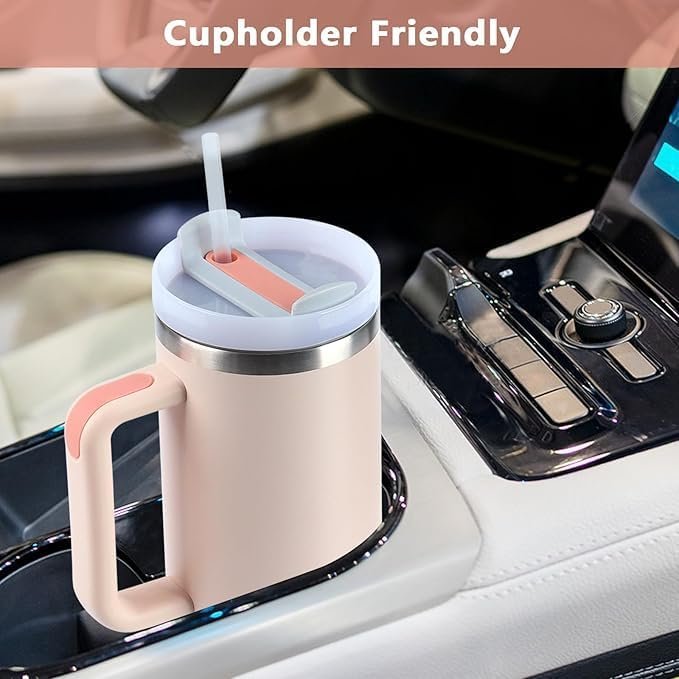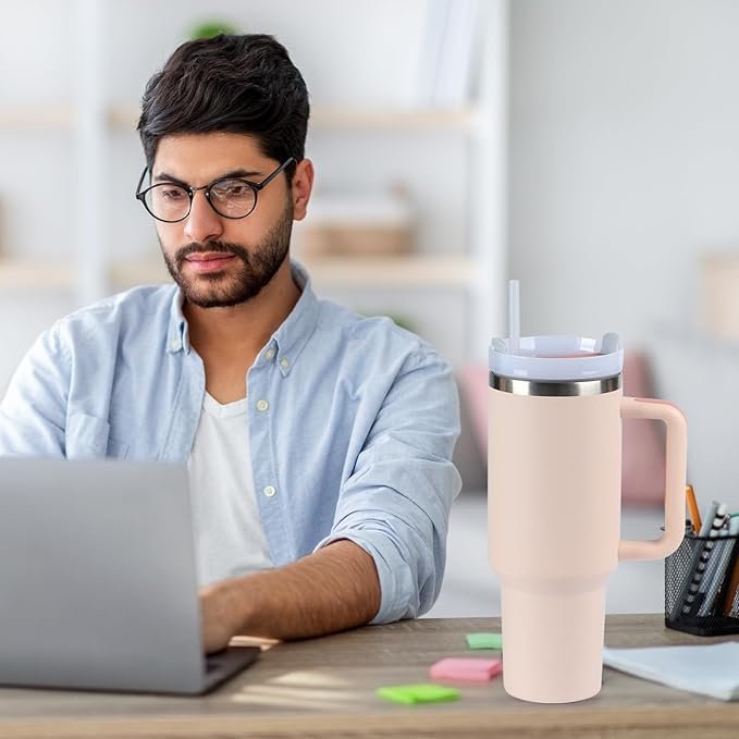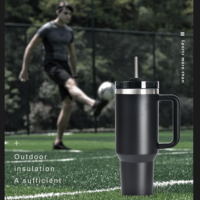 Keep your drink hot or cold: With its vacuum design, this thermal mug keeps your drinks at the perfect temperature for hours. Whether you prefer hot coffee or ice water, this mug is for you. PERFECT TUMBLER WITH HANDLE Vacuum insulated stainless steel tumbler with handle, straw lid and straw, additionally paired with stainless steel straw and silicone cup holder. The BPA-free lid ensures your health and peace of mind, while the wide mouth design makes it easy to clean and refill. Fashionable and durable: perfect for busy days. This insulated tumbler with handle is made of high quality materials to keep your drink hot or cold for up to 24 hours. Drinking from a cup with straw and lid for adults is a whole new level of drinking. LEAK PROOF & LEAK PROOF LID The leak proof lid ensures your drink stays in place even if you accidentally knock your tumbler over. Wide mouth design makes it easy to put ice and fruits in and easy to clean. Each mug comes with 1 lid and 1 straw. MULTIPURPOSE Use this insulated tumbler with straw for drinks like water, coffee, tea, juice, smoothies and more. With a capacity of 1.2L, a water cup with straw and lid is always practical.