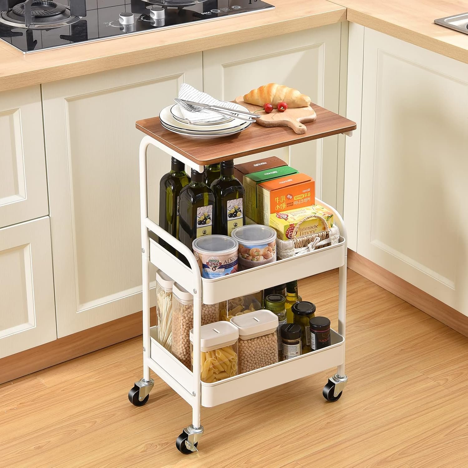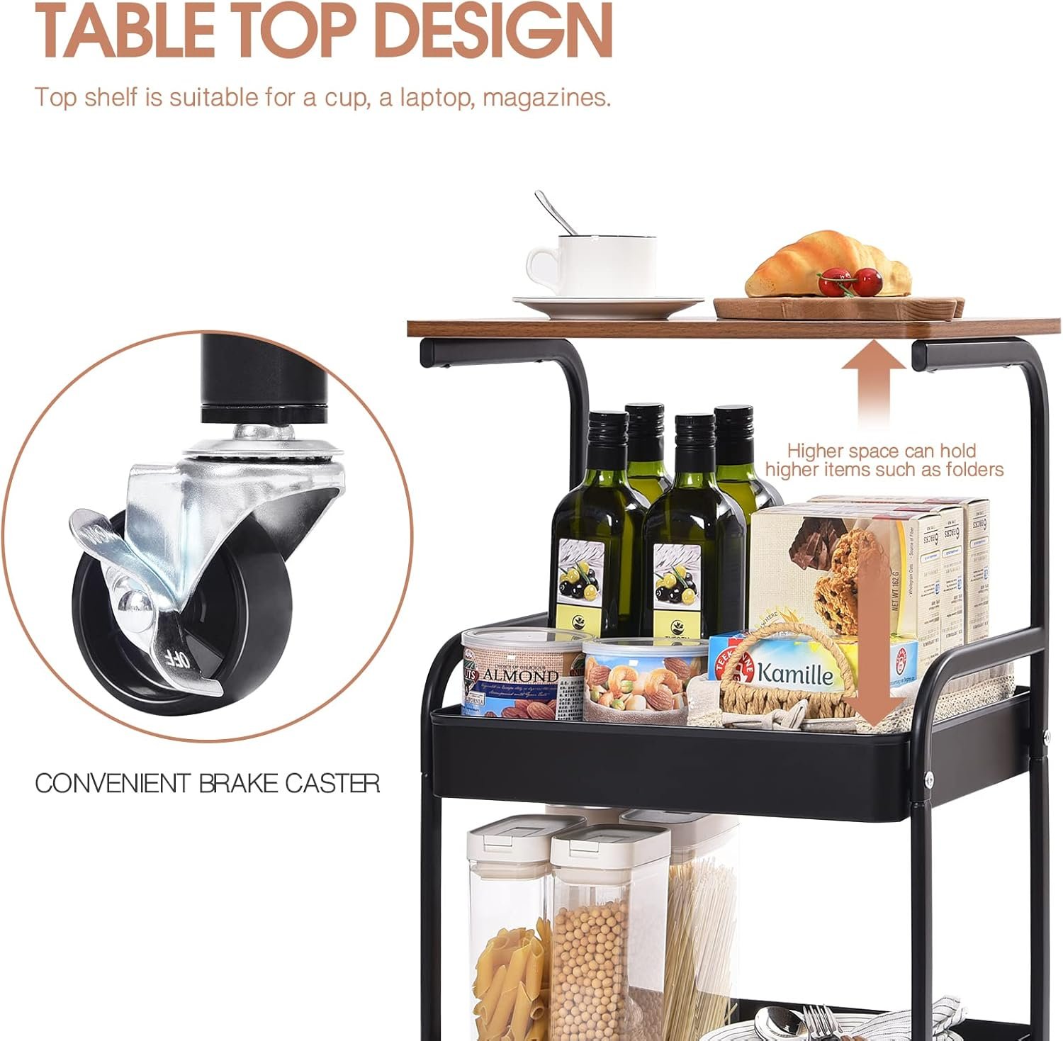 【Large Storage & Easy Installation】The 2 large baskets provide enough storage space for your daily life, optimize the space utilization, and make the messy room tidy. This 3 tier utility cart with tabletop comes with assembly tool, easy to put it together within 10 mins