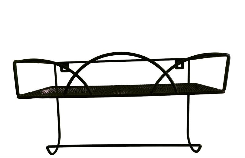 Vintage scrollwork design black metal and rustic burnt kitchen storage wall shelf rack perfect for storing spices condiments seasoning, cookbooks, dishes, and other kitchen accessories towel roll holder can be easily removed from the shelf for quick and easy roll changes; ideal for use with standard size paper towel rolls **Paper towels not included** Visually striking scrollwork style black metal design paired with a rustic burnt shelf adds a touch of charming decorative accent to any home kitchen setting