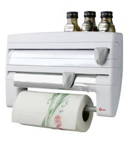 Kitchen wipes brand metaltex holder , consists of three laps in a single paper holder for the kitchen and aluminum foil and nylon transparent paper to make it all in hand and ready for use .
