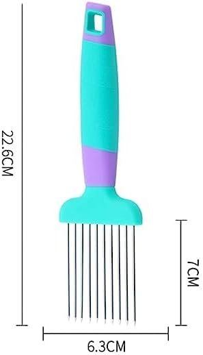 Easy To Use & Convenient: The onion slicer helps with chopping when you don’t want to pull out the chopping machine, just stick it into food and hold it on hand, then you can slice/cut/cube vegetable, fruit and meat quickly. Turn and cut another side directly after slicing, you can get diced easily, and without touching the food, no more onion/fish smell on your hands again.