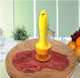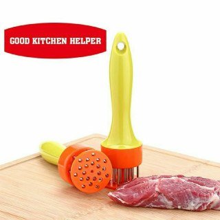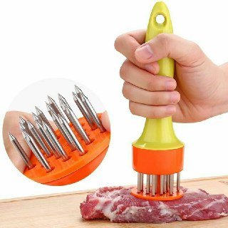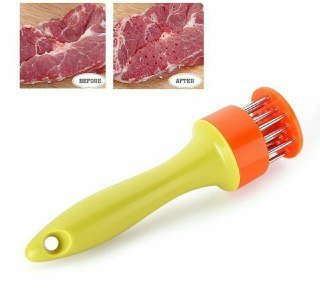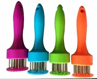This professional-grade tool, with stainless-steel prongs to break down tough meat fibers, provides controlled, uniform meat tenderizing. You can also use it to pierce meats before they're marinated so flavors penetrate deeply. The 2-inch-diameter plastic disk on the bottom is spring-loaded. It provides precise control when the tenderizer's handle is pushed down, so the prongs pass through the disk's holes and into the meat. When you release downward pressure, the handle springs up again, poised to tenderize another section with the same smooth, uniform action.