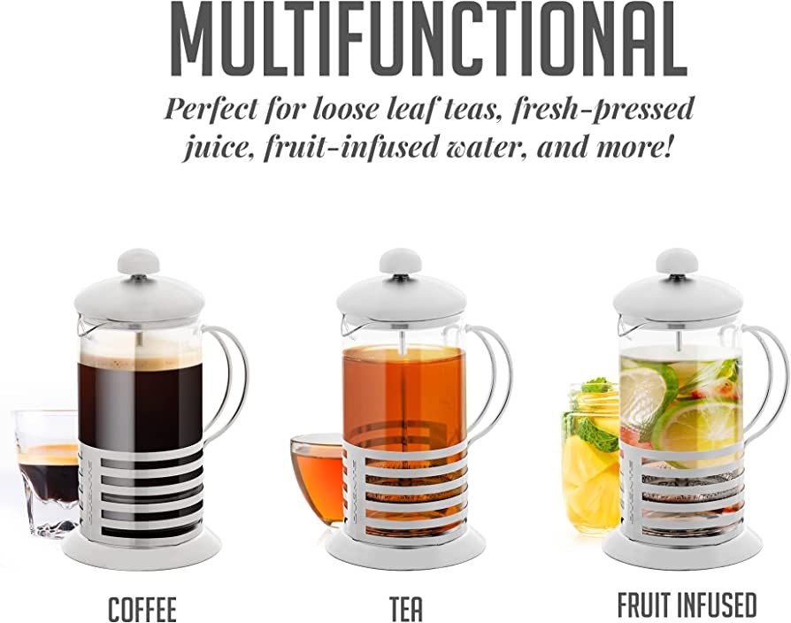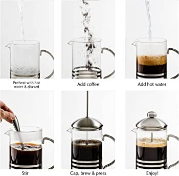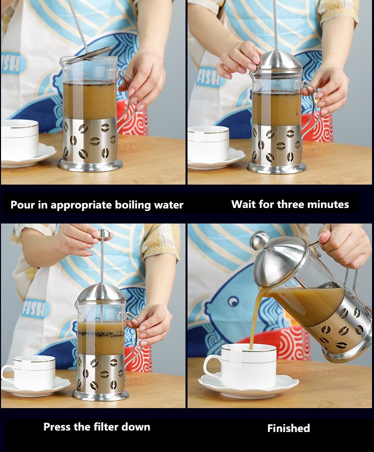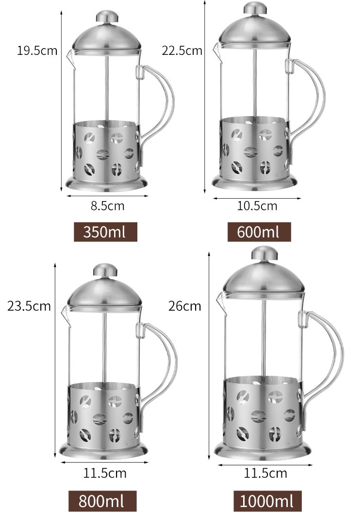 Description: Made of stainless steel+high borosilicate glass,Coffee Maker is healthy and safe,smooth and burr-free exterior,solid structure.Make silky-smooth and pure taste coffee for you.Effectively remove tea leftovers and improve the filtration by 50%.The fragrance is long and mellow. Steps: 1.Pour the ground coffee into the coffee pot 2.Pour in a small amount of boiling water to make the coffee powder evenly moist 3.Pour an appropriate amount of boiling water 4.Cover the lid and wait for 3 minutes 5.Press down the filter 6.Enjoy when the coffee is out Specification: Name:Coffee Maker Material:304 stainless steel,high borosilicate glass Specifications:350ml,600ml,800ml,1000ml Uses:making coffee,tea,milk froth Packing List: Coffee Maker x 1 Note: 1.Due to differences in lighting and screen settings,the color of the item may vary slightly from the picture. 2.Please allow for slight size differences due to different manual measurements. Good Quality Material:Made of stainless steel+high borosilicate glass,healthy and safe,smooth and burr-free exterior,solid structure.Coffee Maker is reliable to use. Anti-scalding Handle:Coffee Press Espresso Maker has an anti-scalding handle design,rust-proof and thickened design,sturdy and durable.You don't need to worry about your hands getting hurt. Easy to Clean:Coffee Pot is easy to clean,wash in warm water,does not fade,dishwasher safe.Durable and can be used for a long time. Three-layer Filtration:Effectively remove tea leftover,make silky-smooth coffee for you,and the fragrance is long and mellow.Effectively improving the filtration by 50%,pure taste. Widely Use:Suitable for both adults and children at home.Glass Coffee Pot can also be used for outdoor camping,tourism,hiking,beaches,picnics,etc.