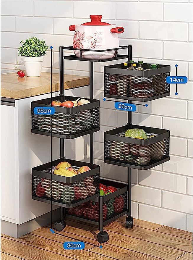 Large storage space: Rolling cart with Multi-layer basket to provide sufficient space for your daily storage; the edges of the basket are heightened and thickened to ensure that your items remain secure when the cart is moving, encrypted wire mesh breathable basket keeps fruits and vegetables fresh. Easy movement: Equipped with 4 omnidirectional casters wheels, 2 of them with metal locks that make the cart can be used both mobile and stationary. You can roll it in any direction easily with little effort. 360 rotating and lockable wheel storage trolley: This kitchen storage trolley made of high-quality metal material has 4 Pieces 360 wheels (2 lockable) are, which is not easy to scratch the floor, can move and turn effortlessly put the cart in and out from small spaces. High quality material: Kitchen carts on wheels use solid steel plate structure and high-quality baking paint process to pto prevent rust or corrosion. Versatile storage: The household shelf is very suitable for storing kitchen accessories, vegetables and fruits, tools, plants, art supplies, toys, toiletries, office supplies, etc.