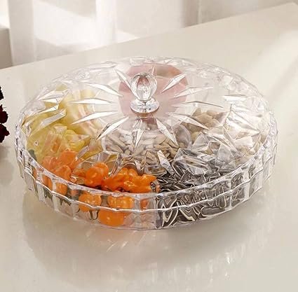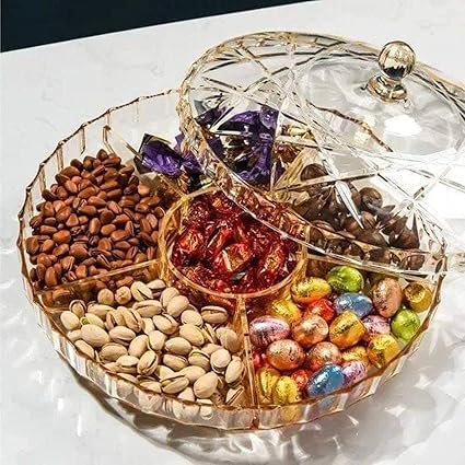 Tasli Acrylic Serving Platter is perfect for serving your guests on special occasions. This plate is made of high quality acrylic, ensuring lasting use. It has 6 compartments that are large enough to store dry fruits and sweets. The dish has a lid on top, allowing you to keep the inside items safe from contamination.