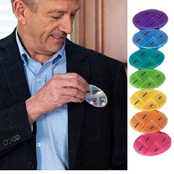 Funky Weekly Pill Organizer: This unique 7-day morning weekly pill organizer is designed to store plenty of medications and vitamins of all sizes and shapes in one place. Facilitates the management of weekly prescriptions.