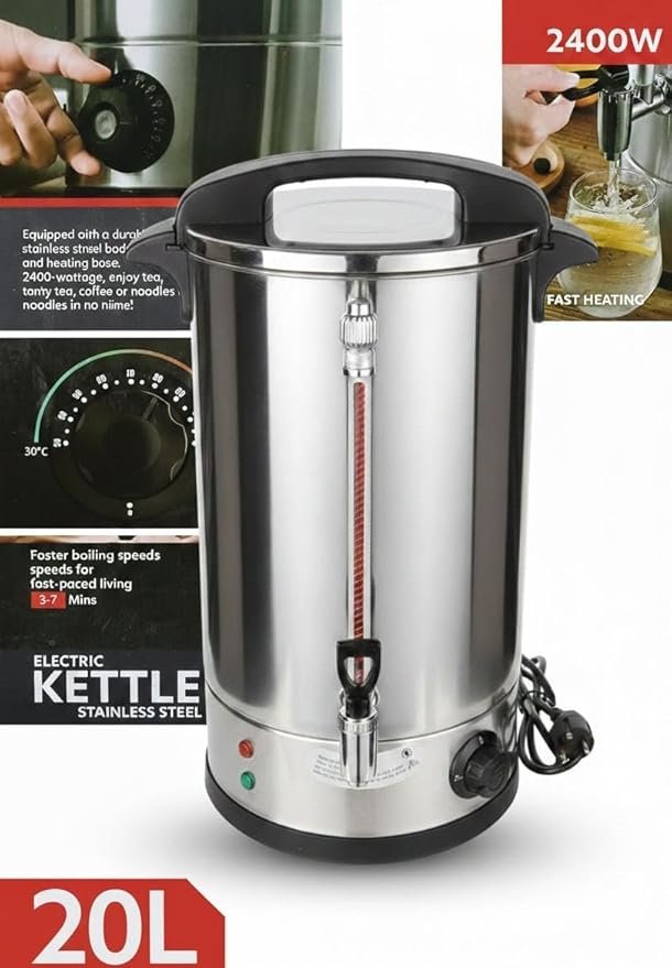 Upgrade your beverage service with this20L Stainless Steel Electric Water Urn. Designed for "fast-paced living," its 2400W power ensures boiling speeds in as little as 3 minutes. The adjustable thermostat gives you full control over the water temperature, while the sleek, durable design makes it an essential appliance for any kitchen, office buffet, or social event.