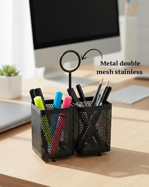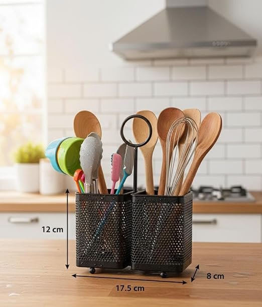 This is a versatile, compact organizer featuring a durable dual-compartment metal mesh design finished in classic black. It's engineered for multi-purpose use, serving perfectly as a stationery holder on a desk for pens and markers, a cutlery caddy in the kitchen for storing spoons and forks, or an elegant makeup brush holder on a vanity. The product includes a practical central ring handle for easy carrying and mobility, while the stable, compact base ensures it takes up minimal space on any surface. Its perforated mesh construction allows for excellent ventilation, keeping contents dry and organized.