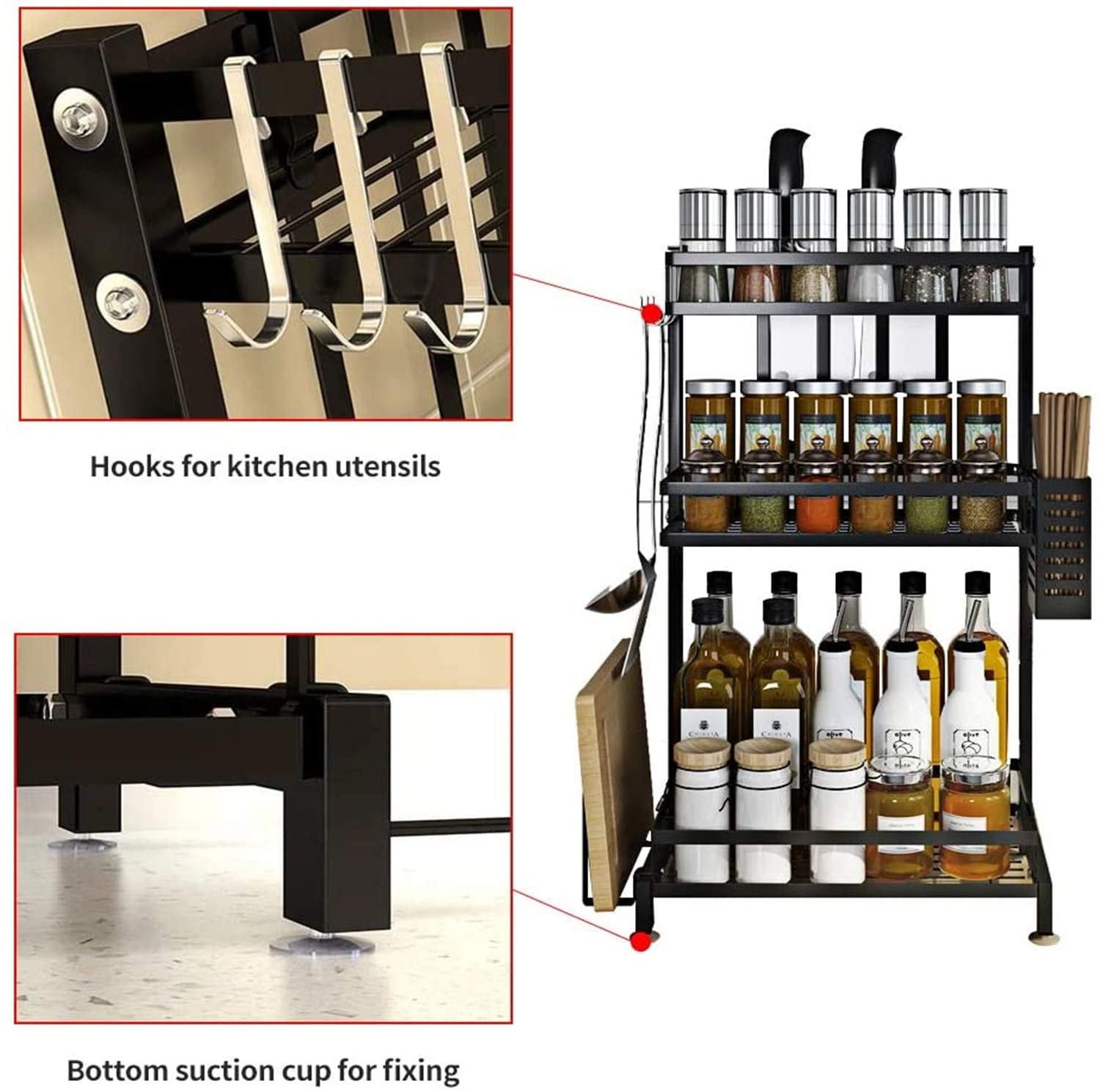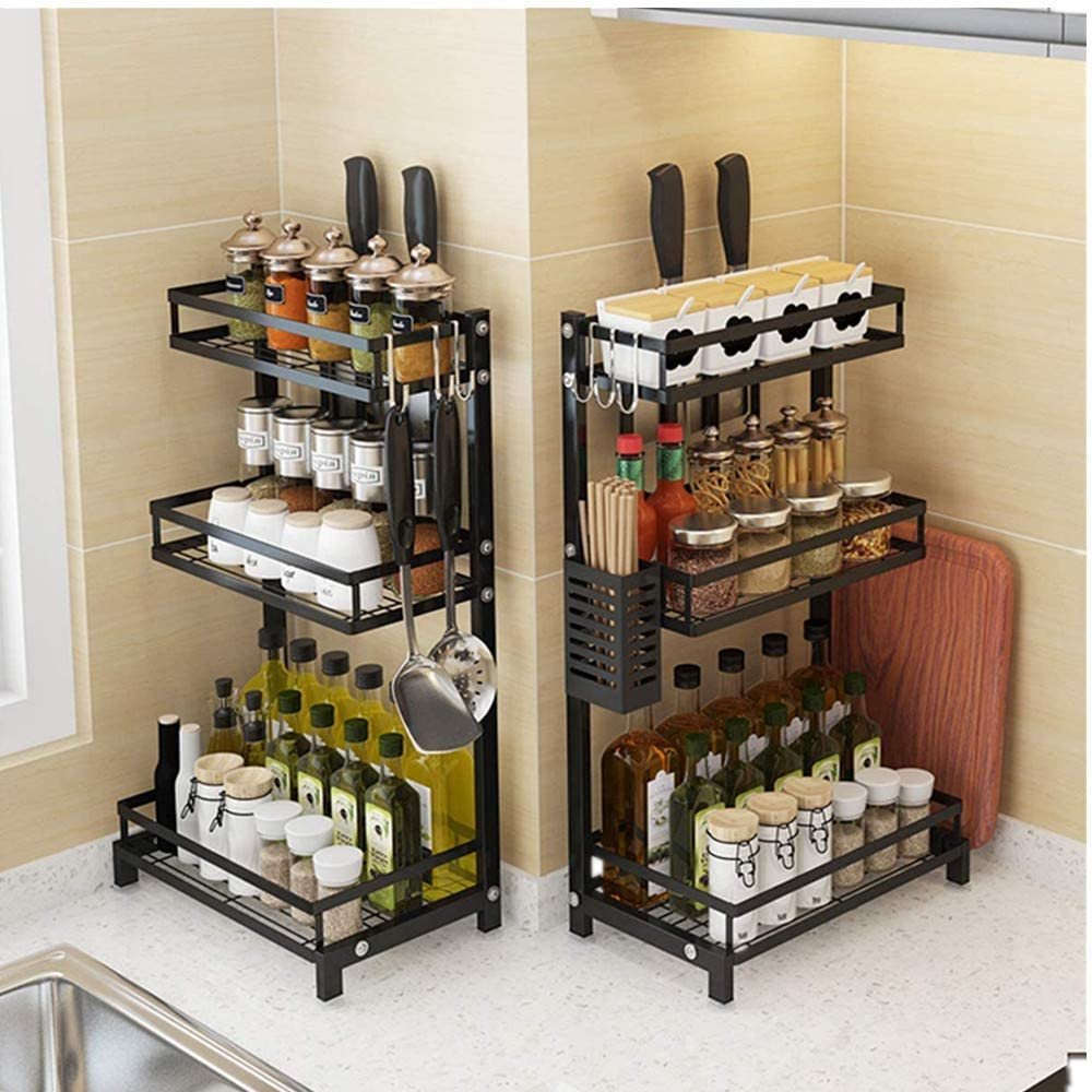 ALL IN ONE PIECE: 3 Tier Spice Rack is perfect for your choice to organize all things like kinds of different spice, seasoning, essential oil, sauce, soup cans in one piece. Also, one complete set is combined with one knife block, one holder for utensil another for cutlery holder, totally meets your demand of a tidy and neat kitchen.
