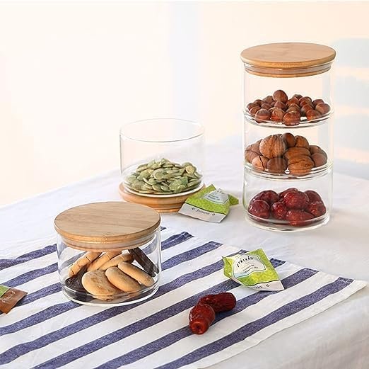 3 tier stacked round apothecary jars with Wooden lid and wood spoon and clear construction that allows you to see the contents inside while adding style to your storage