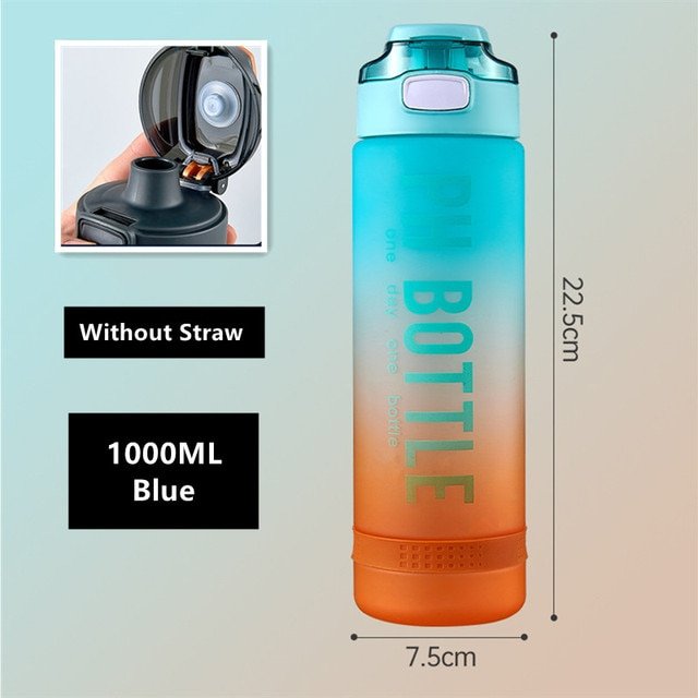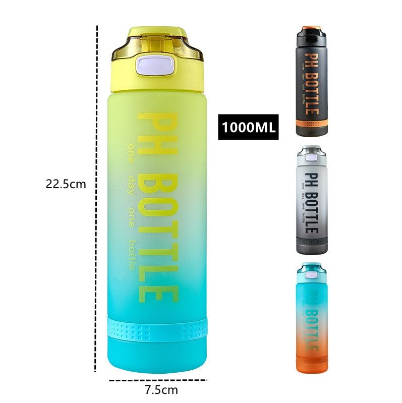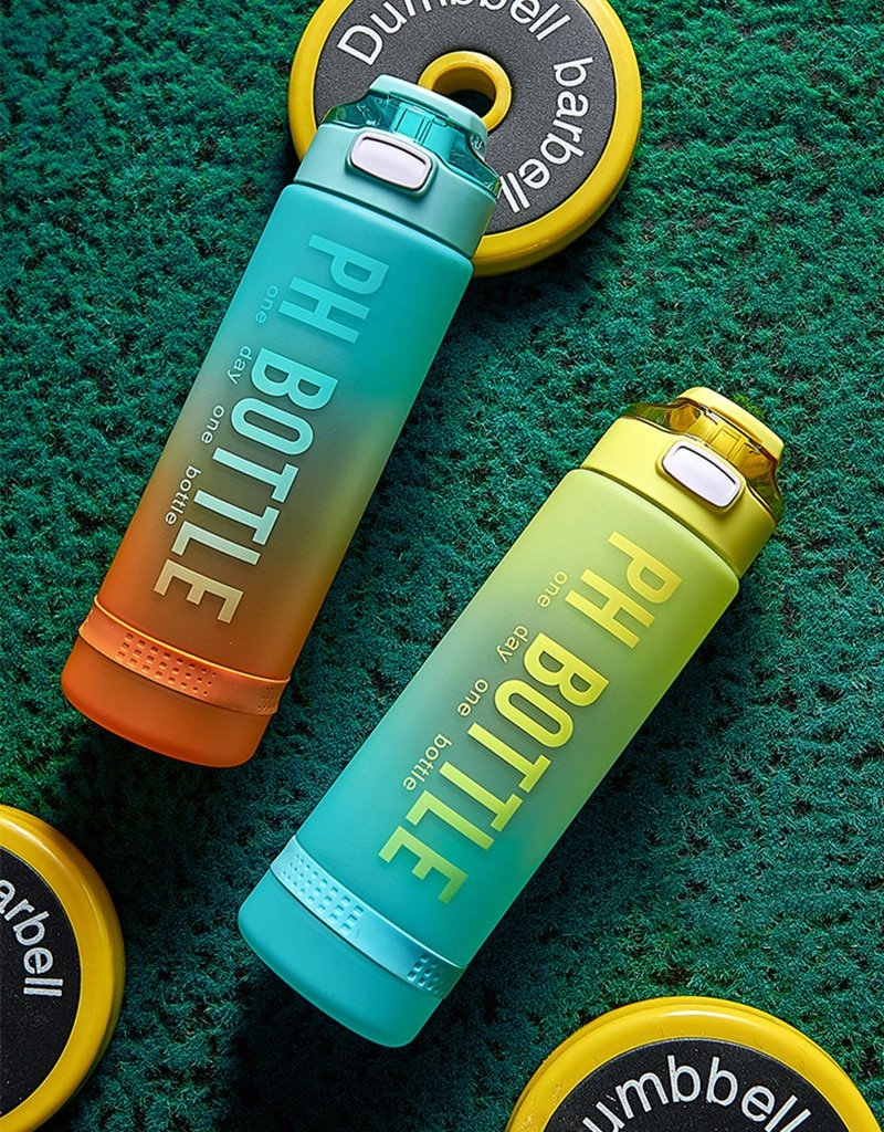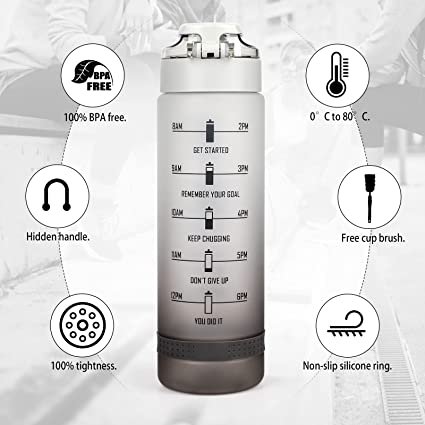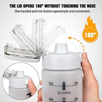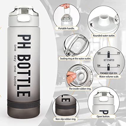 Humanized functional design--the portable handle integrated with the bottle cap makes the sports water bottle more convenient to carry around. Has a pleasing matte translucent look. The wide mouth design makes it easy to clean and easy to put in ice cubes and fruit, perfect for your needs. The bottle has a unique water volume mark and time mark to remind you to drink water in time.