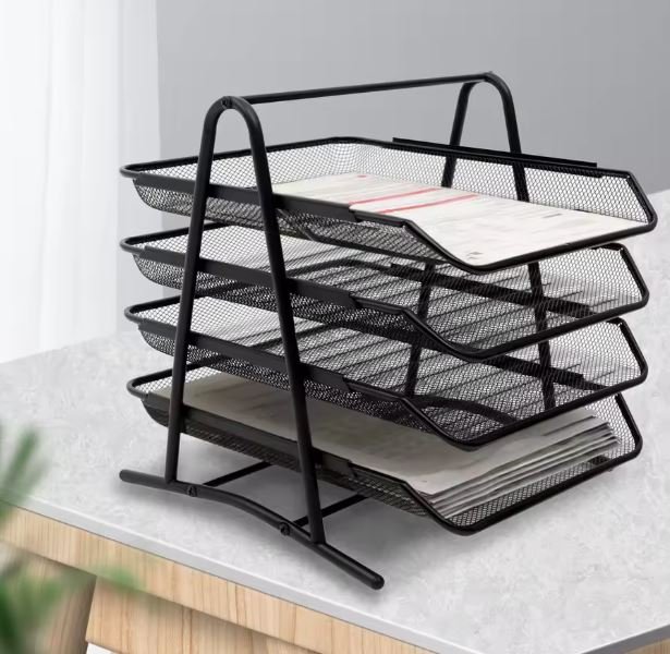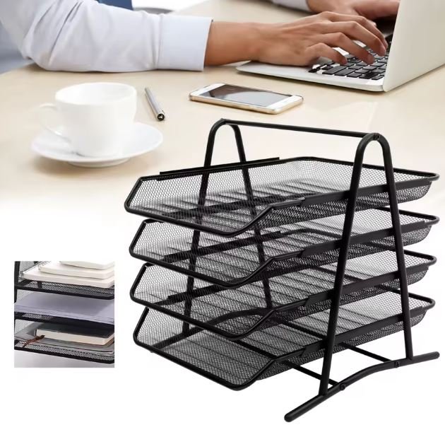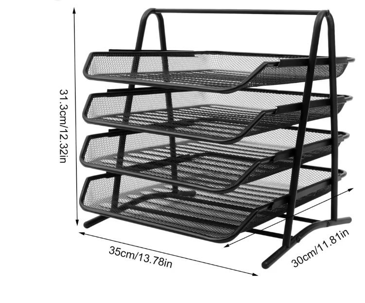 Size: 35 x 30 x 31 cm. There are three parts to store different files or office supplies without taking up too much space on the desktop. 2.Material:Metal This file holder is made of metal mesh, so that the table top not only remains clean, but also strong and breathable. This allows the files to be stored safely. 3.Applicable occasion: It is very suitable for offices, schools, libraries, receptions, apartments or other workplaces. It can easily store and eliminate the clutter on the desk. 4.Versatility: This desktop organiser is an ideal choice for books, letters, magazines, brochures and other office supplies, providing you with a tidy workplace. 5.Easy assembly and large storage space: you can assemble it in a short time, and the storage space is large enough to hold most books.