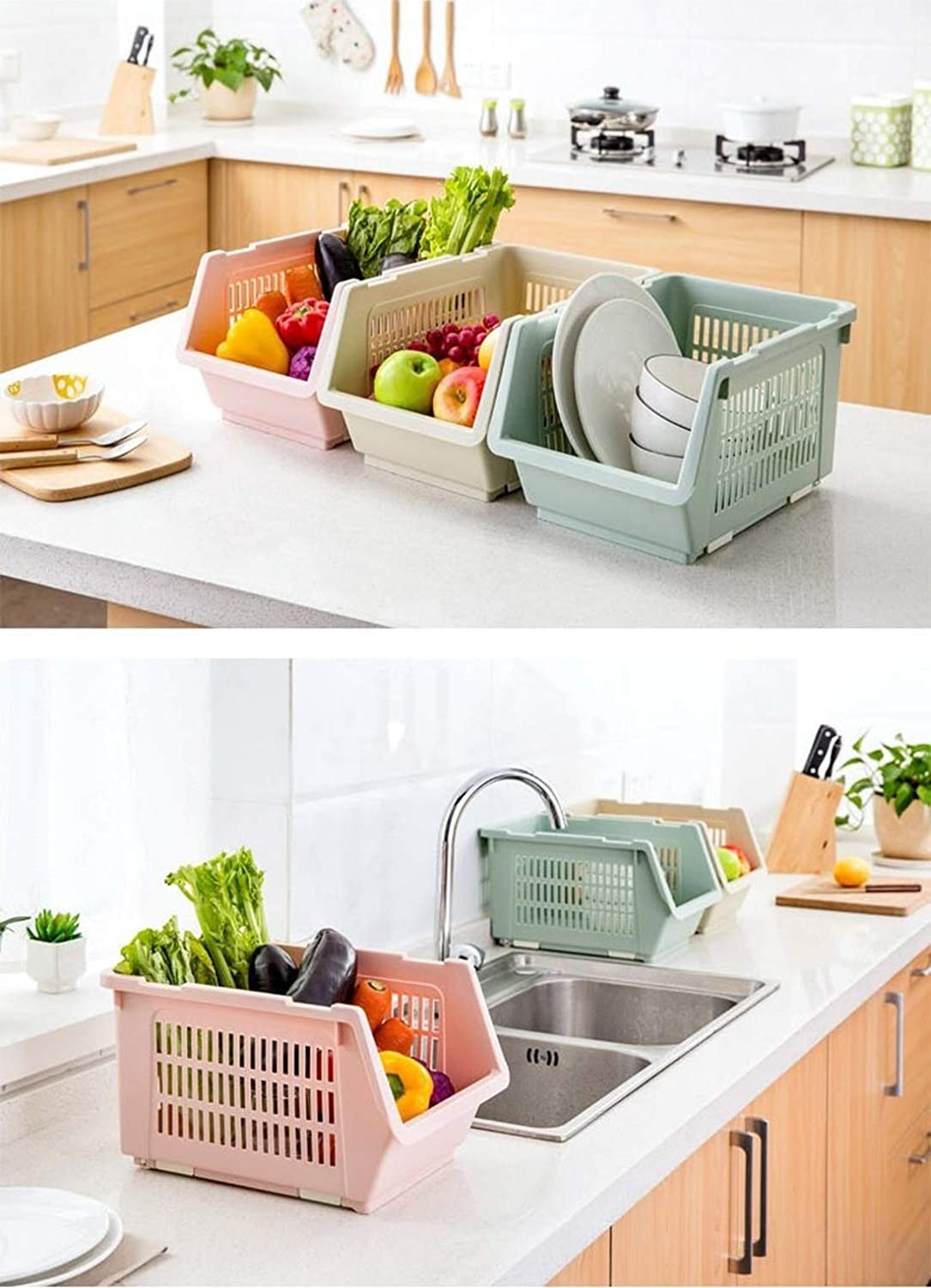 Stackable storage basket: Our storage basket comes with the solid stretchable stands, and you can extend the stands then stack each basket. The stackable storage baskets can save space and keep the house tidy and clean. The hollow basket can keep the fruits and vegetables fresh and is perfect as an onions and potatoes storage bin.
