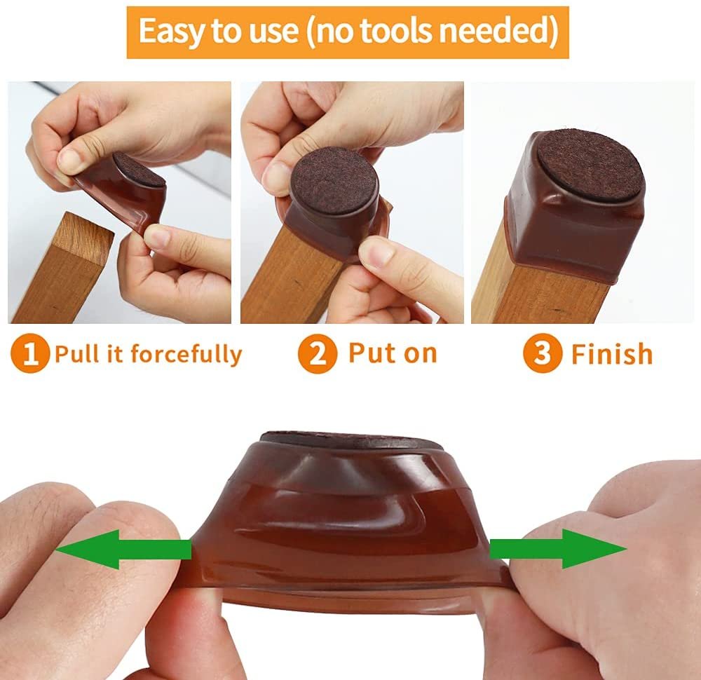 CHAIR LEG FLOOR PROTECTOR IT IS NOT NECESSARY TO BE STICKED, THE GEL BOX OF SILICONE FIRMLY HOLD THE FEET OF THE CHAIR EASY TO WRAP THE FURNITURE LEGS AND IS NOT EASY TO FALL PROTECT FLOOR AND FURNITURE FROM SCRATCHES AND DAMAGE AND REDUCE NOISE EFFECTIVELY THERE WILL BE NO SCRATCHES NO NOISE WHEN MOVING YOUR FURNITURE